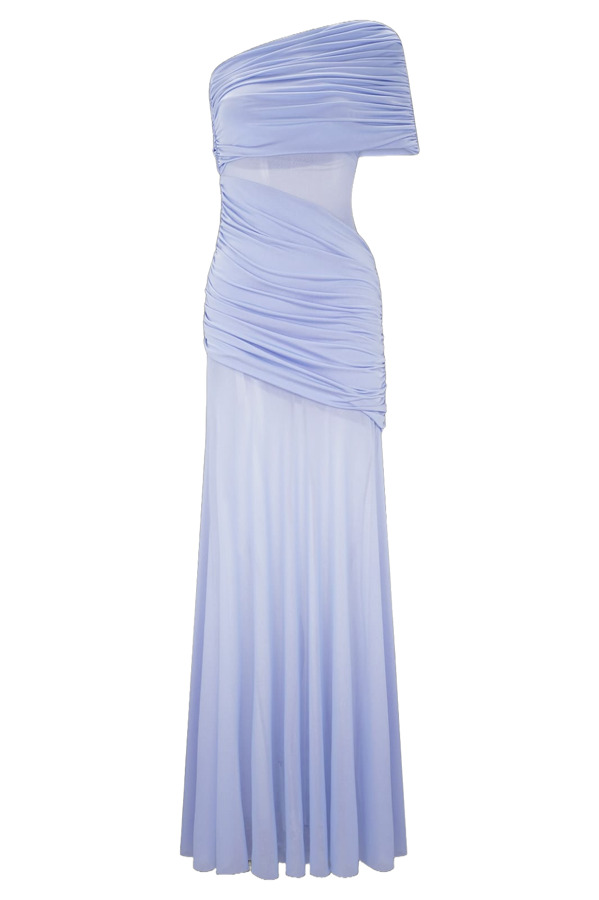 The Hikari Midi Dress by CHATS by C.DAM is a stunning long dress that beautifully balances minimalism with multi-detail structure. Made from a blue stretch fabric, it features ruched detailing that elegantly hugs the body. The dress is adorned with a distinctive metal button, adding a touch of sophistication. Its V-neck design and long sleeves create a chic silhouette, while the concealed rear zip fastening ensures a seamless look.