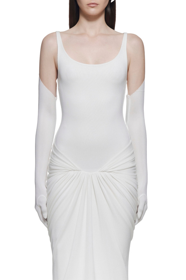 The JESSE Dress is a form-fitting long gown crafted from interlock knit. It features elegant sleeveless detailing and gathered draping at the hipline, beautifully accentuating the figure while adding a touch of sophistication and style.