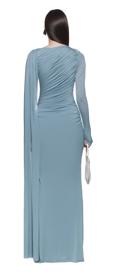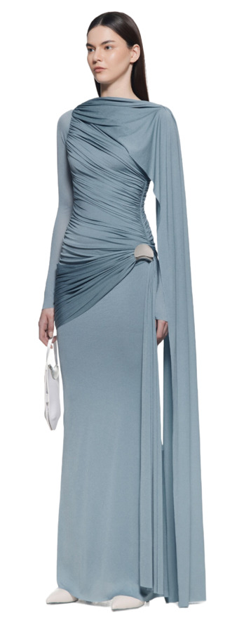 A body-hugging long dress that plays by its own rules—featuring an asymmetrical flap and hipline gathers that curve into a gleaming metallic accent. Sculpted, sultry, and unapologetically luxe, it’s the kind of dress that makes subtlety blush.