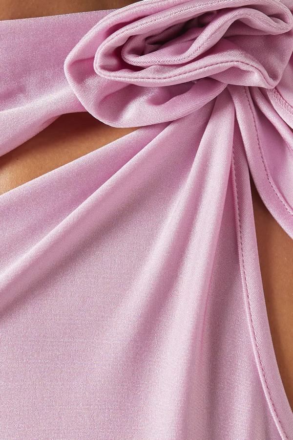 Minimalist with a chic edge, this Coperni gown captures the brand’s signature aesthetic. Crafted from stretch fabric that drapes smoothly over the body, it features a cut-out neckline and knotted rose detailing that elevate the look from simple to statement. Timeless and refined, it’s your go-to gown for year-round, RSVP-ready style.