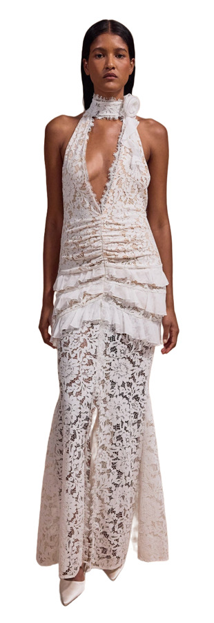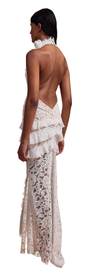 Embrace elegance with the Backless Lace Maxi Dress! This full-length maxi features a stunning backless design and a halter neck for a chic look. The semi-sheer skirt is complemented by a lined main body for modesty, adorned with beautiful rose appliqué. The fishtail skirt includes a godet and front split, adding a touch of drama. Complete with a concealed side zip, this dress is perfect for special occasions.