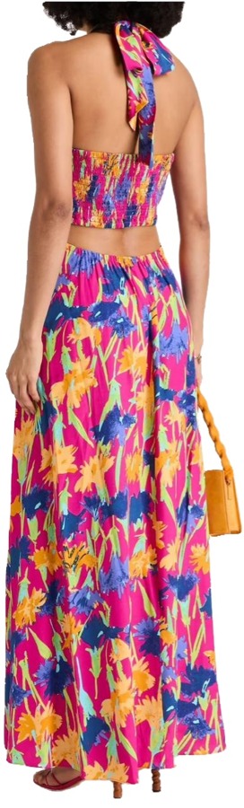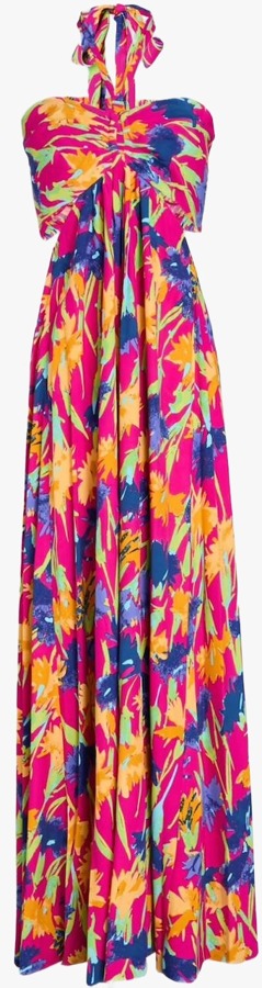 A vibrant floral print on lightweight crepe with a flattering halterneck neckline and flowing floor-length silhouette. Perfect for daytime events, its subtly sexy cut can easily be dressed up or down for any occasion.
