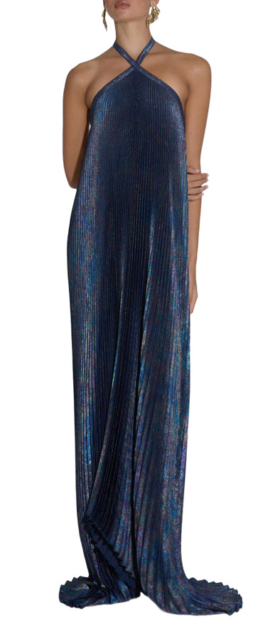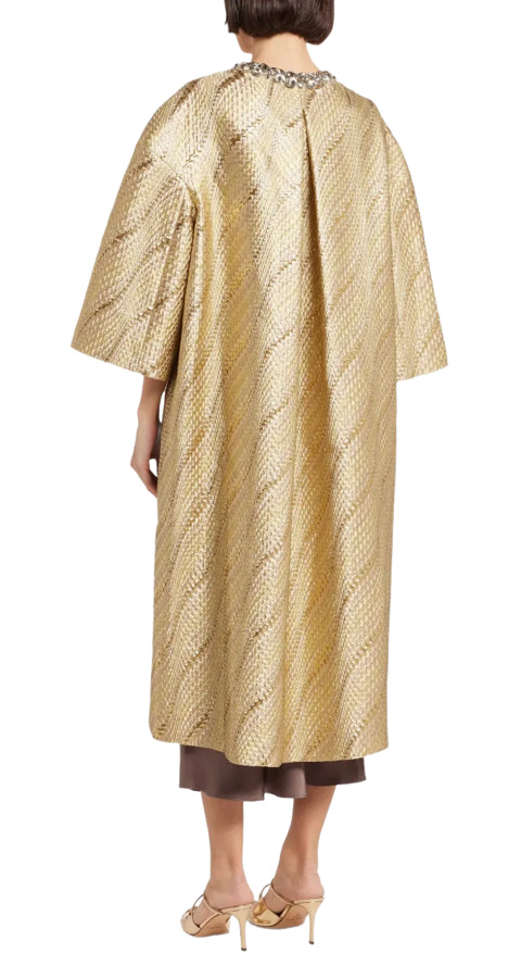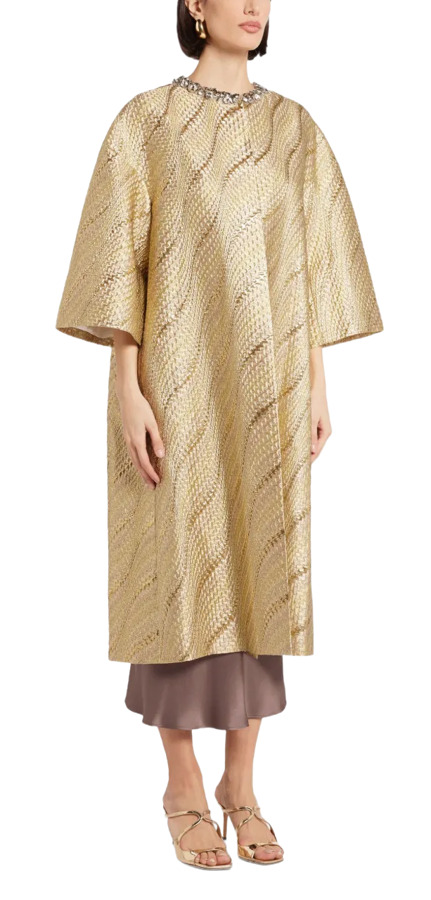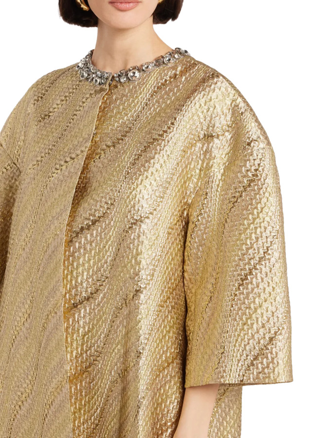 The Dice Kayek crystal-embellished coat is a showstopper in gold-tone, radiating luxury. With a chic concealed front button fastening and a stylish knife-pleat design, it drapes beautifully. The drop shoulder and three-quarter length sleeves add a modern twist, making this coat a glamorous statement piece for any occasion. Wear it to shine!