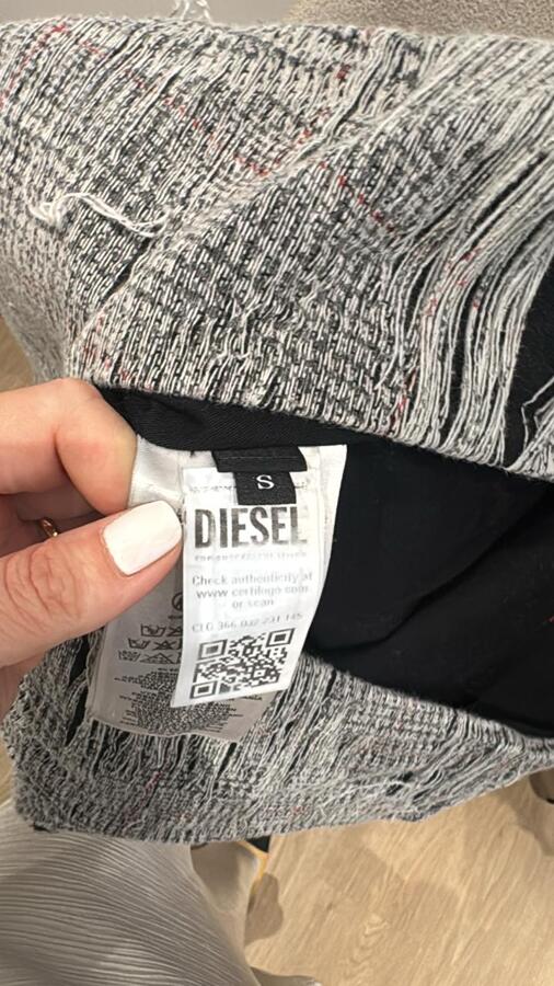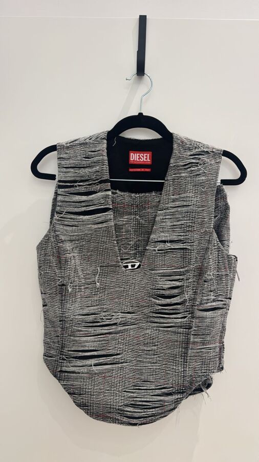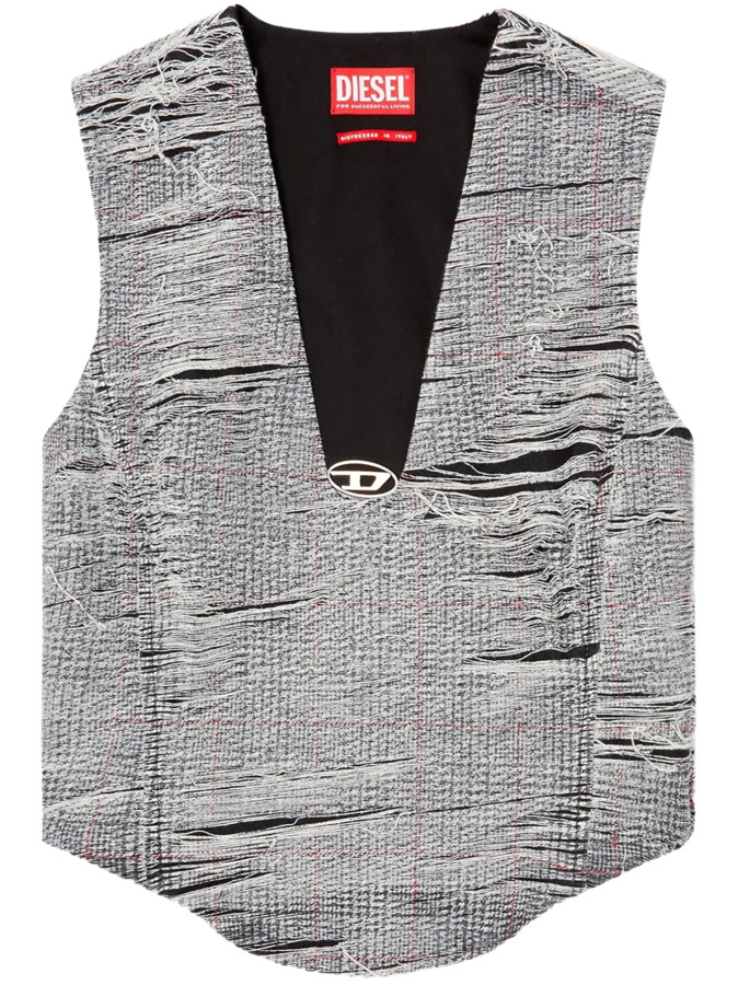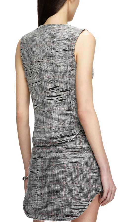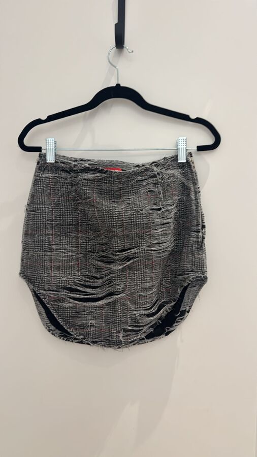 Unleash bold style with the De-Laris Skirt Set by Diesel. This chic duo includes a medium grey top featuring a V-neck, distressed finish, and a curved hem. The matching ash grey skirt showcases a Prince of Wales check print with ripped detailing, both equipped with concealed side zips for a polished look. Ideal for making a striking runway impression!