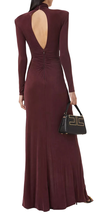 Make a statement after dark with the Cut-out Draped Maxi Dress from Elisabetta Franchi. Crafted from fluid cupro jersey, this stunning dress features a high neckline, gold-tone logo hardware, and artful draping for a defined silhouette. Pair it with heels and a chic clutch for an elegant look at formal dinners or evening events!