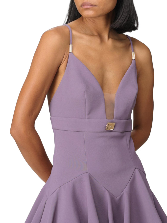 This double crepe mini dress features stylish cups and a layered ruffled skirt, creating a playful yet sophisticated silhouette. A striking gold metal logo plaque adorns the neckline, adding a touch of elegance. Perfect for making a statement at any occasion, this dress combines playful design with high-fashion elements.