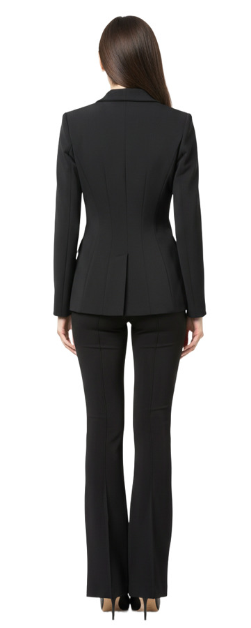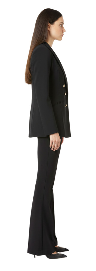 Discover the chic Elisabetta Franchi Blazer and Trousers Set. The blazer features a sophisticated shawl-lapel design with double-breasted buttons in luxurious jet black, complemented by gold-tone accents. Paired with retro-inspired trousers made from double-layer stretch crepe, these pants showcase a double C plaque detail, bold flared hems, and pressed pleats, creating a polished, tailored look for any occasion!
