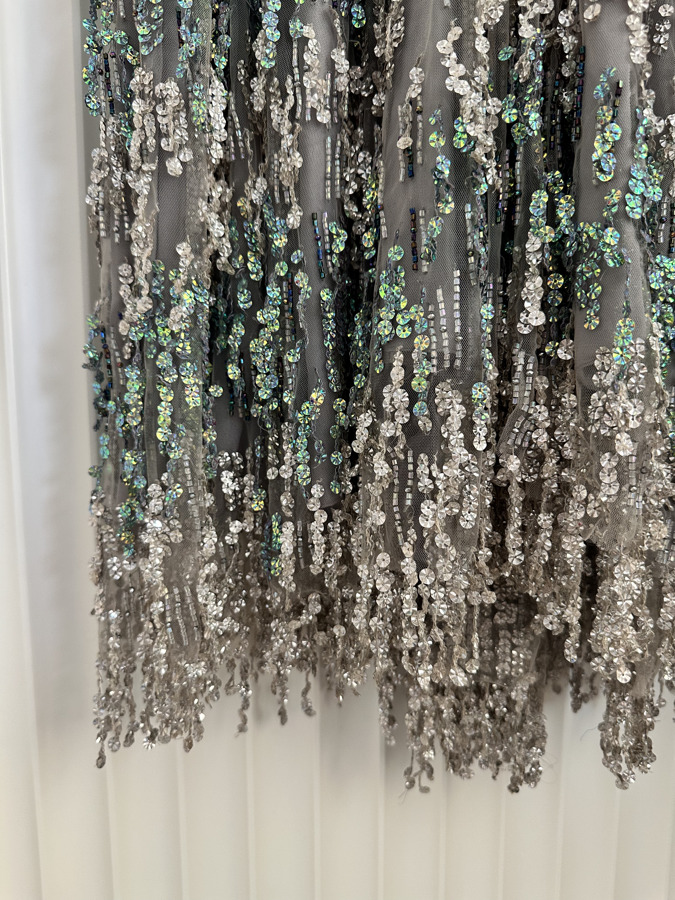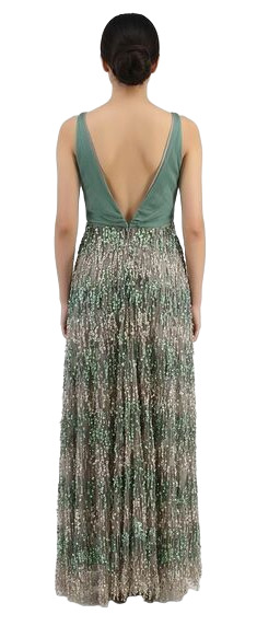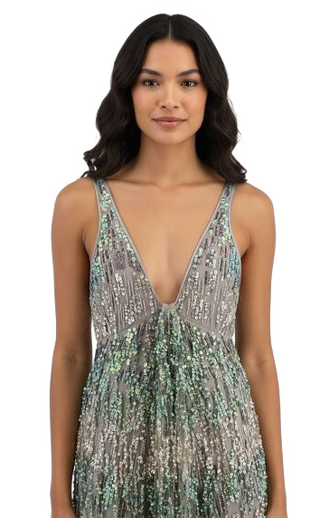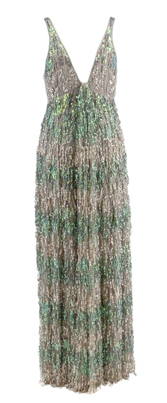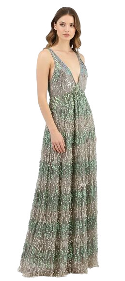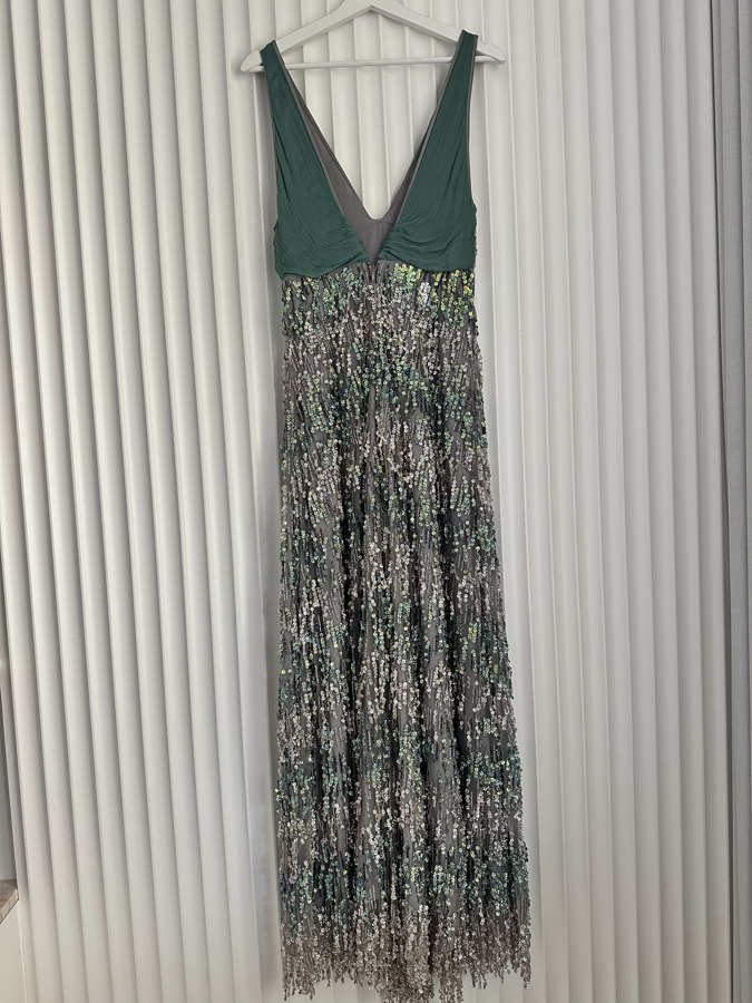 Stunning Runway piece gown, beading is moving as you walk. Step into red-carpet glamour with the Emporio Armani Evening Gown! Crafted from luxurious silk, this stunning piece showcases a dramatic deep-V neckline and a flowing silhouette adorned with shimmering grey and green sequins. Perfect for galas, weddings, or black-tie events, the intricate embellishments catch light from every angle. Embrace modern allure and make a show-stopping statement!