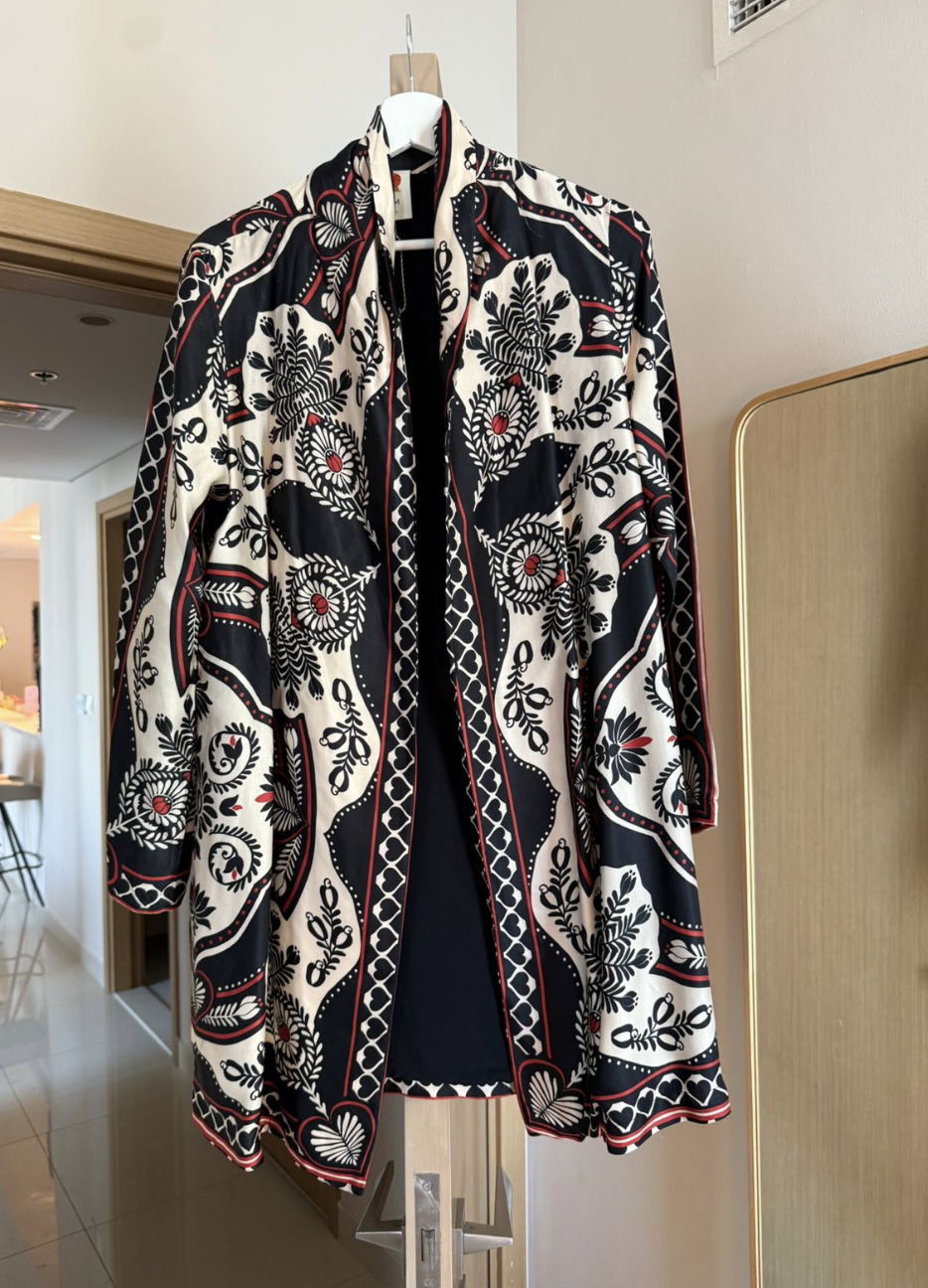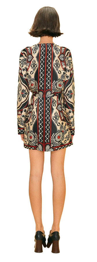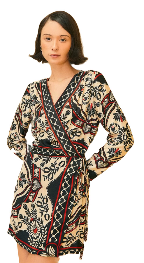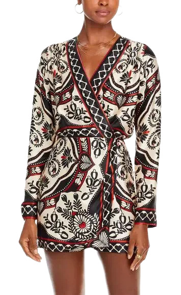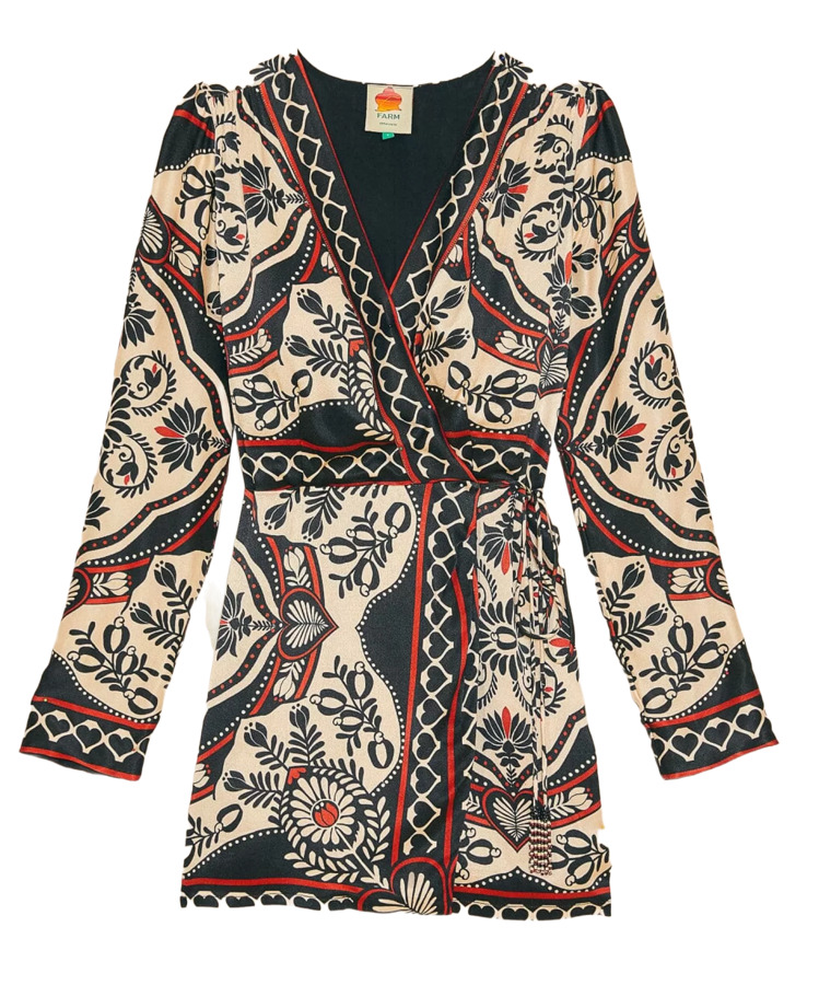 The Farm Rio Black Passion Scarf Mini Wrap Dress features a flattering wrap silhouette with long sleeves and a V-neckline. This bold, printed mini dress blends feminine charm with effortless style—perfect for day-to-night dressing and standout moments.