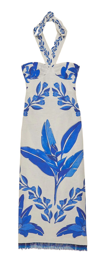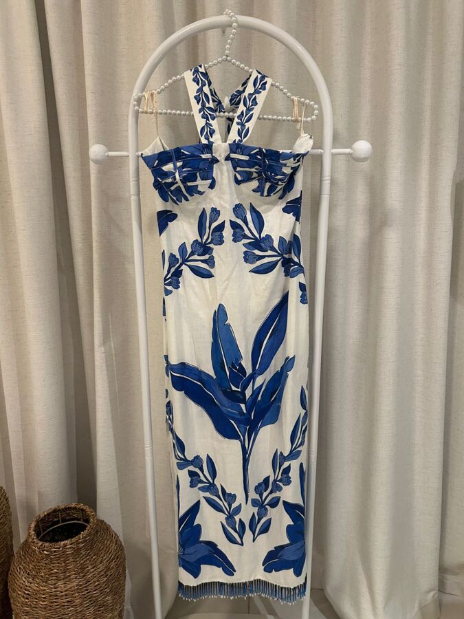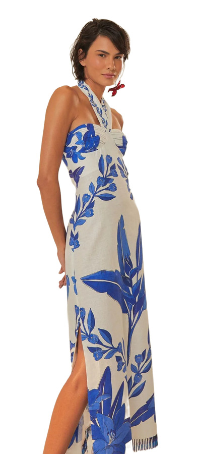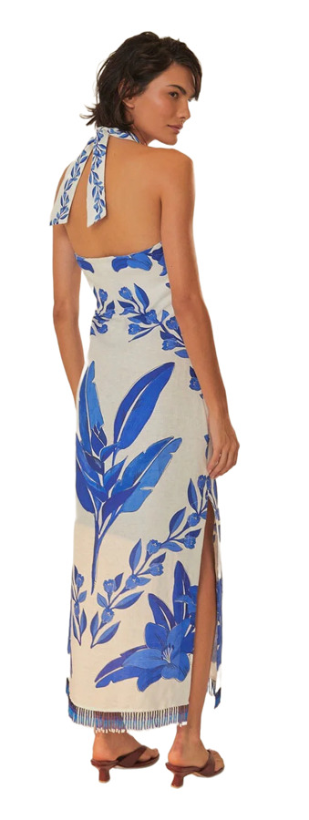 Channel tropical chic in the Off-White Blue Yard Sleeveless Maxi Dress by FARM Rio. Featuring a halter neckline, striking blue botanical print, playful fringe hem, and a flirty side slit, this flowing maxi moves with effortless elegance. Perfect for beachside strolls, brunch dates, and sun-soaked escapes.