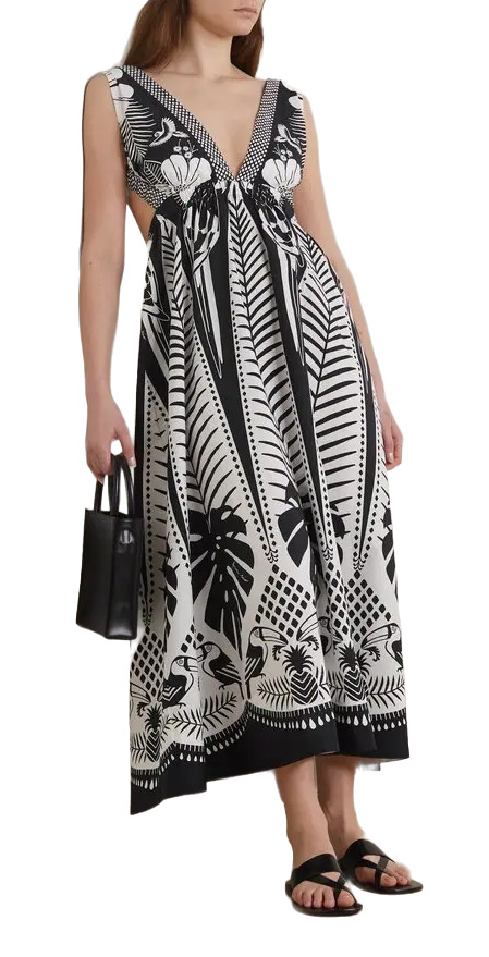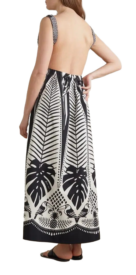 Discover the versatility of the Farm Rio Printed Cotton Dress, perfect for day or evening wear! Its plunging neckline and open back contrast beautifully with the flowing maxi skirt. Complete your look with bold earrings and your signature scent, making this dress an essential addition to your suitcase for any occasion!