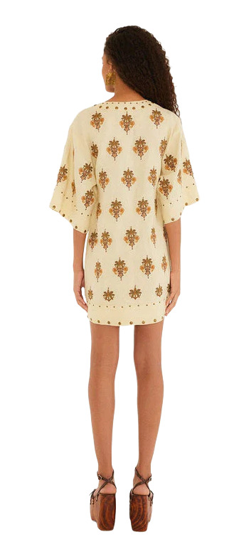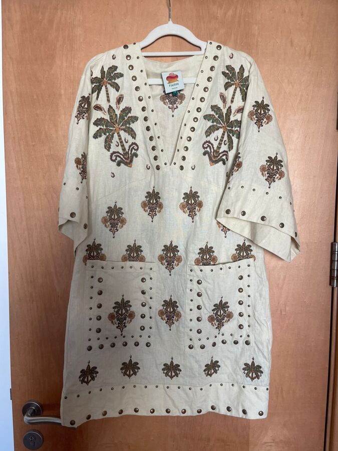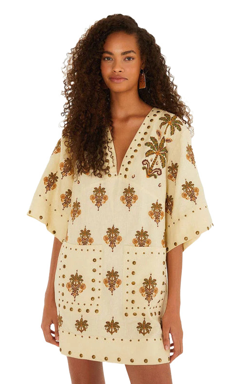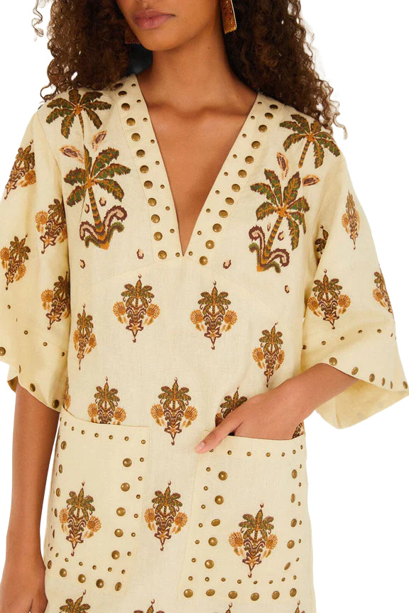 Dive into the tropical vibes with FARM Rio's Sand Coconut Tree Tapestry Linen Mini Dress! Crafted from eco-friendly materials, this playful piece features a chic V neckline and a flowing silhouette that exudes carefree femininity. With short sleeves and handy patch pockets, it's perfect for sunlit adventures, radiating a warm, joyful energy that captures the spirit of summer!