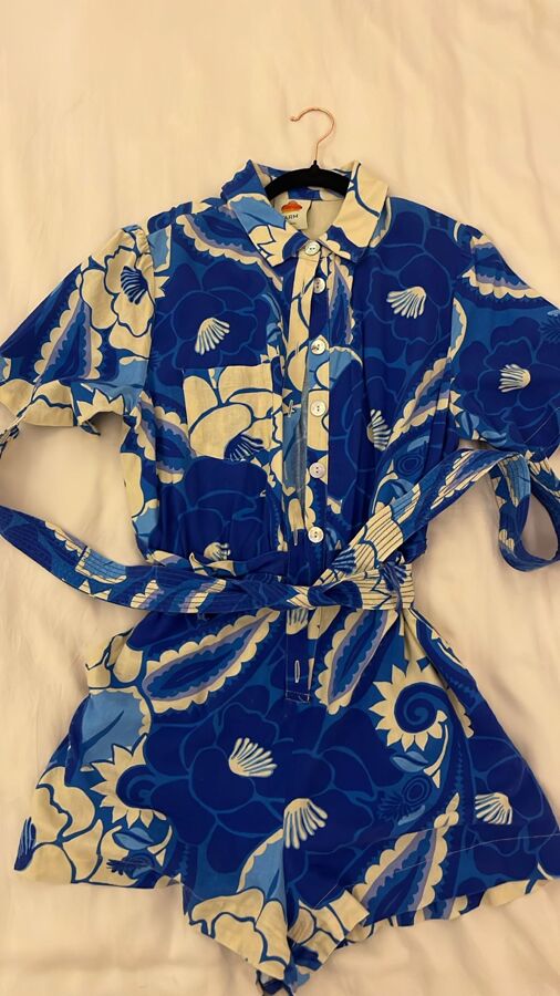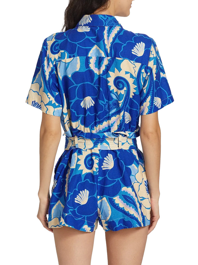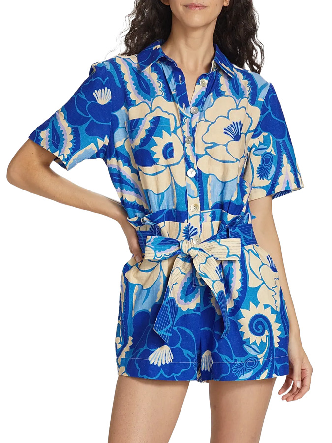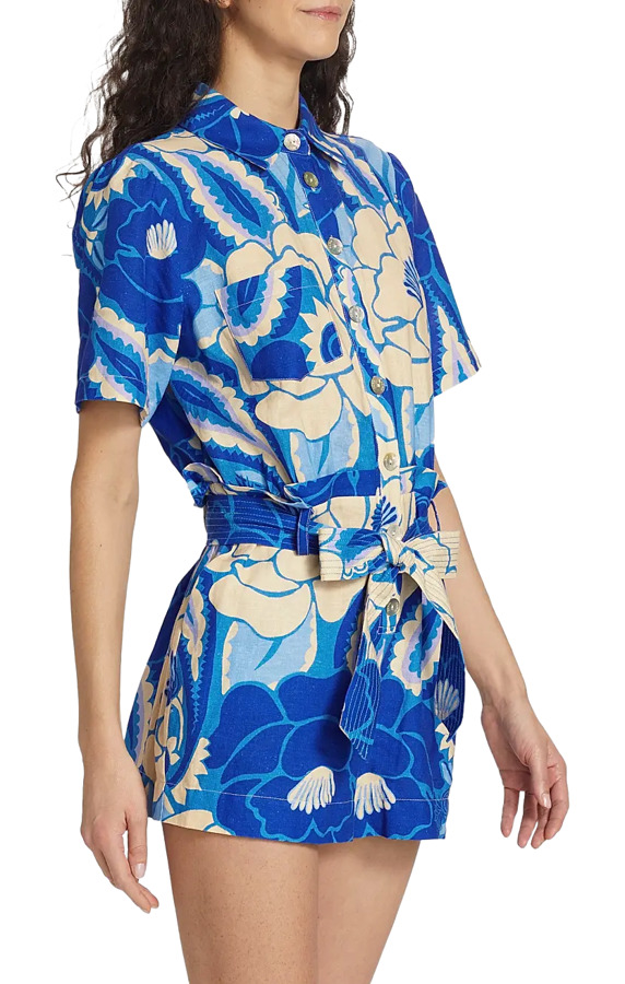 Embrace vibrant style with Farm Rio's Tropical Groove Romper! This floral linen blend romper features a collared short-sleeve silhouette and a flattering paperbag waistband enhanced by a matching self-tie belt. Enjoy functional details like chest patch pockets and side on-seam pockets, along with a chic button-front closure. Perfect for sunny days and casual outings, this romper is a must-have!