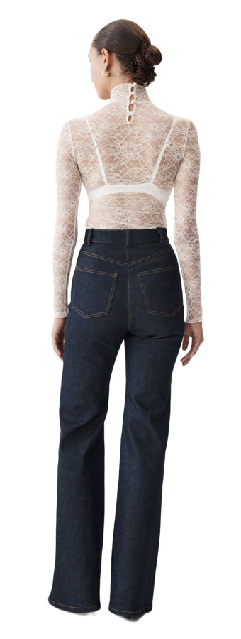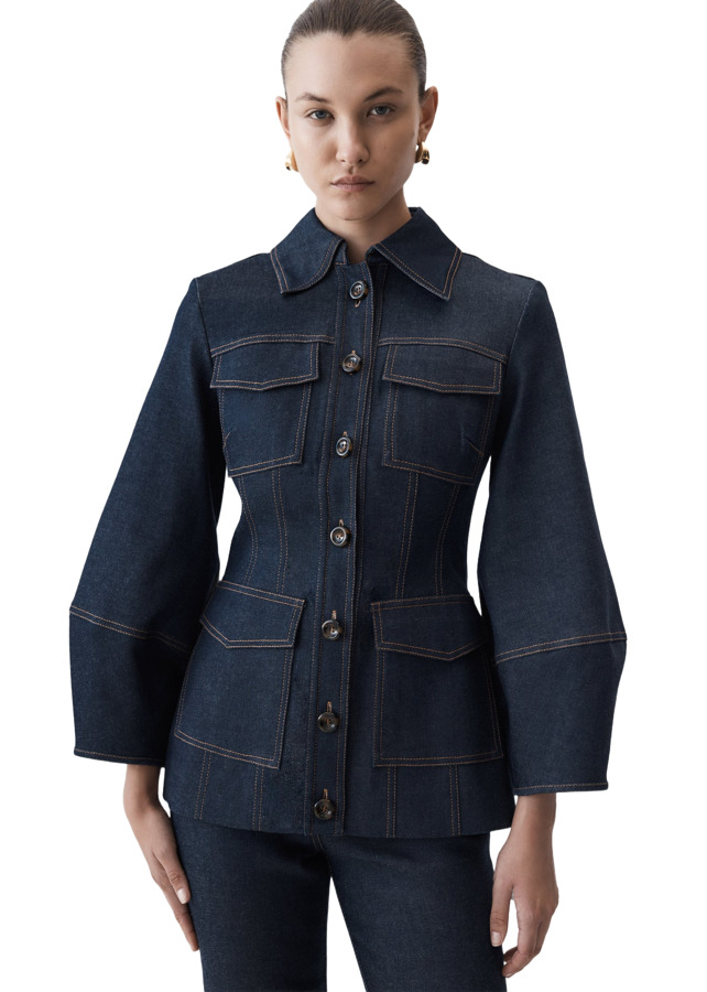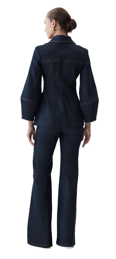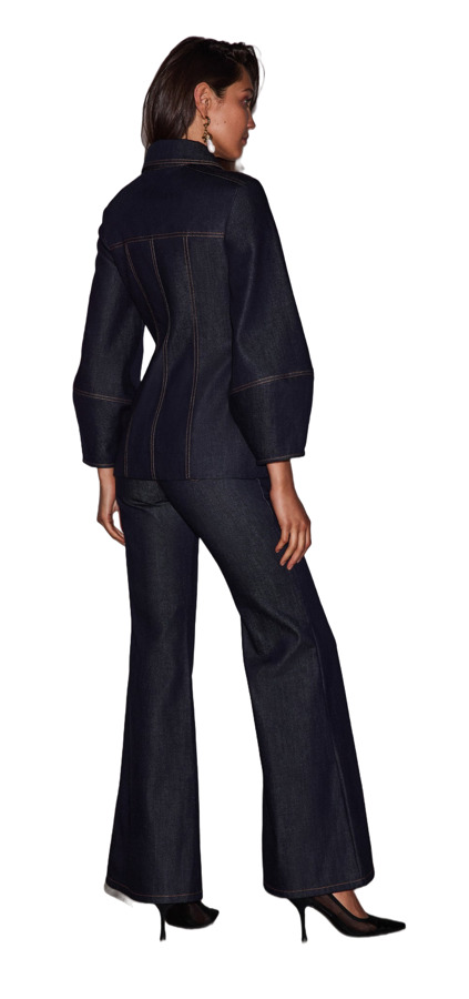 This stylish ensemble features a utilitarian denim safari jacket with romantic puff sleeves, corseting details, and Italian tortoiseshell buttons. It’s paired with elegant high-waist jeans that have a refined flare leg and five-pocket detailing, designed to visually elongate the legs. The combination highlights form and sophistication, creating a chic and contemporary look.