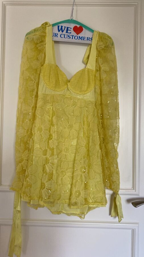 Glow like summer in the For Love & Lemons Kiersten Mini: a sunshiny yellow mini with a dreamy tulle overlay, floral mesh appliqués, and flirty jacquard ties. Unpadded underwire keeps it cheeky yet comfy, while cinched cuffs add playful drama—perfect for stealing the spotlight with a wink.