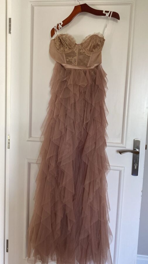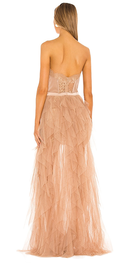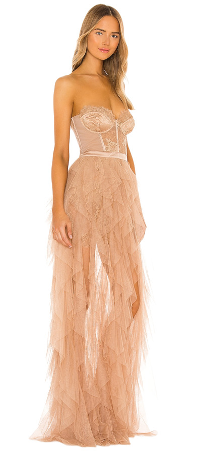 Sultry and theatrical: the For Love & Lemons x Revolve Bustier Gown pairs a boned, underwire bodice with a dramatic tulle train for full-on red-carpet drama. An attached snap-button bodysuit and hidden back zipper ensure a flawless fit, while luxe blends (nylon, polyester, spandex, silk) and a sleek lining keep it comfy. Hem ranges from 24" to 64" for max impact.