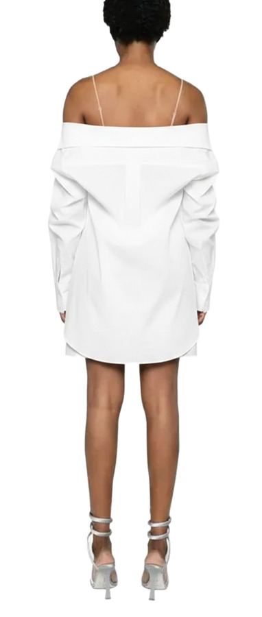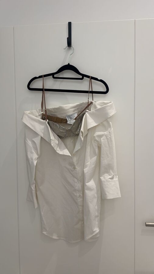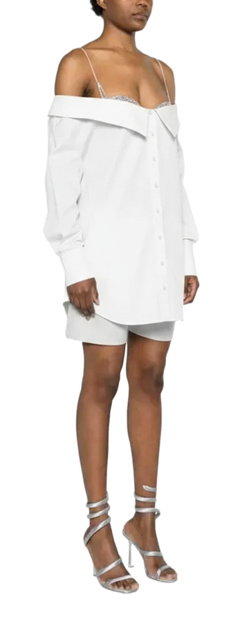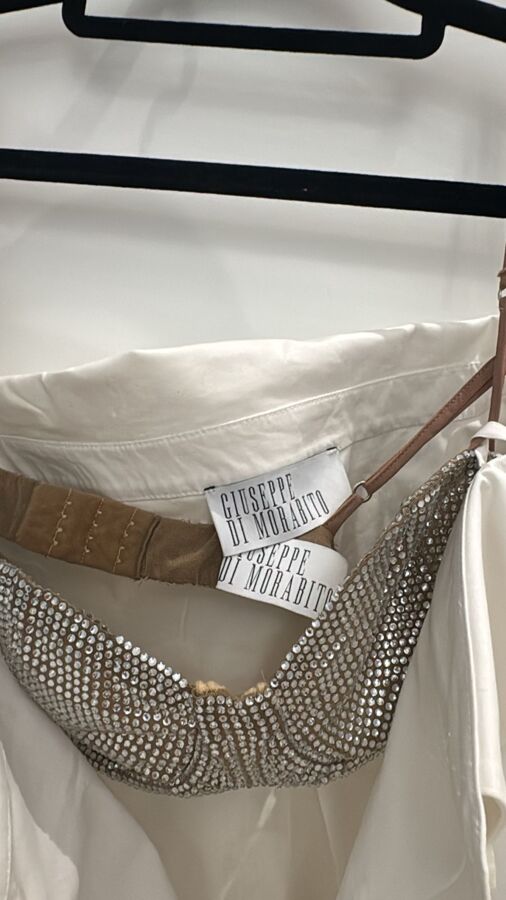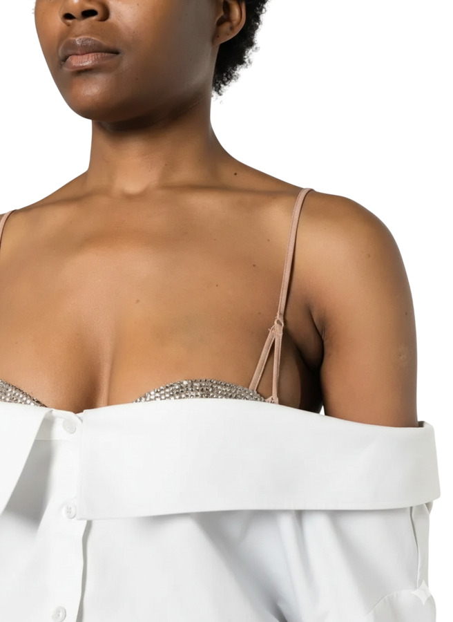 Elevate your wardrobe with Giuseppe Di Morabito's stunning poplin shirt! Crafted from a soft cotton blend, this shirt features dazzling rhinestone embellishments and a chic V-neck with sweetheart styling. With underwire cups, drop shoulders, and long sleeves, it combines elegance and structure. The box-pleat detail and curved hem add a fashionable twist, perfect for any chic occasion!