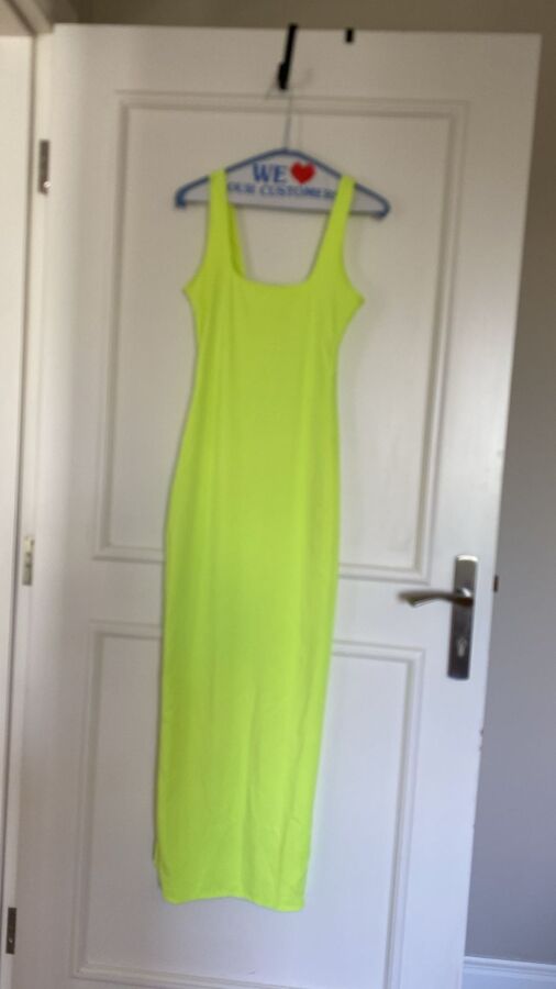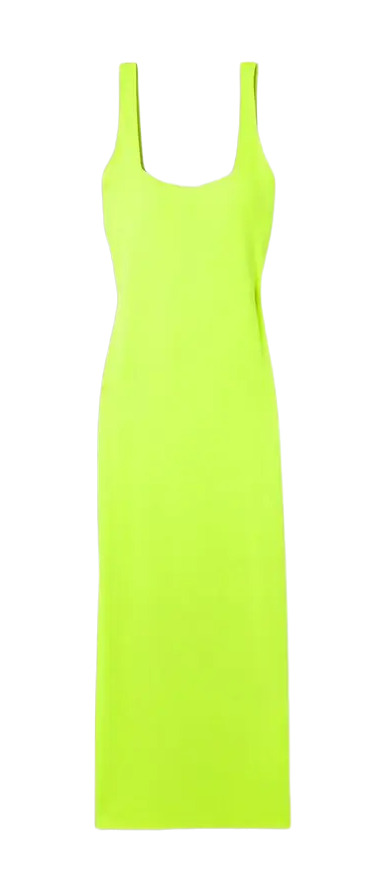 The GOOD AMERICAN maxi dress in vibrant neon is made from scuba fabric and is fully lined for comfort. It features a scoop neck and a stylish back split, designed to slip on effortlessly. Crafted from mid-weight, stretchy material, this dress combines bold color with a flattering fit, making it perfect for various occasions.
