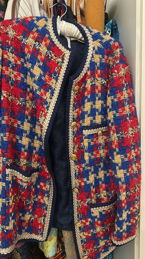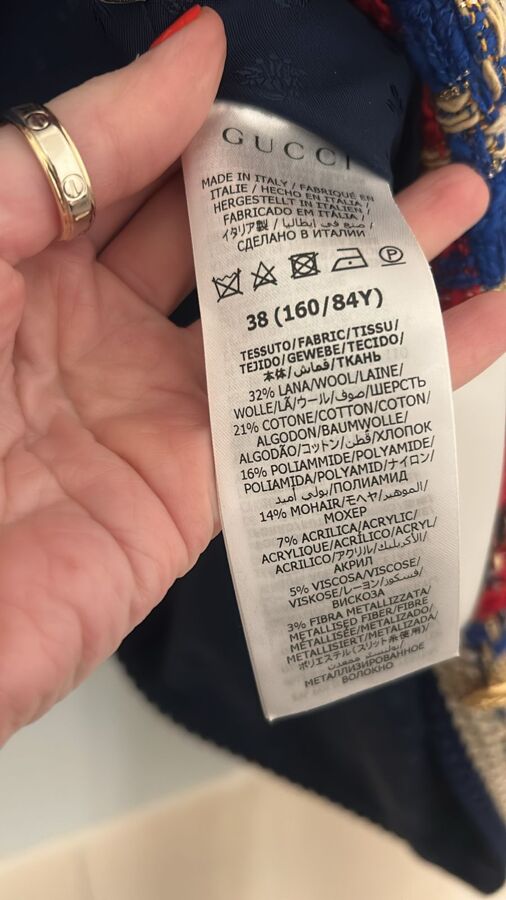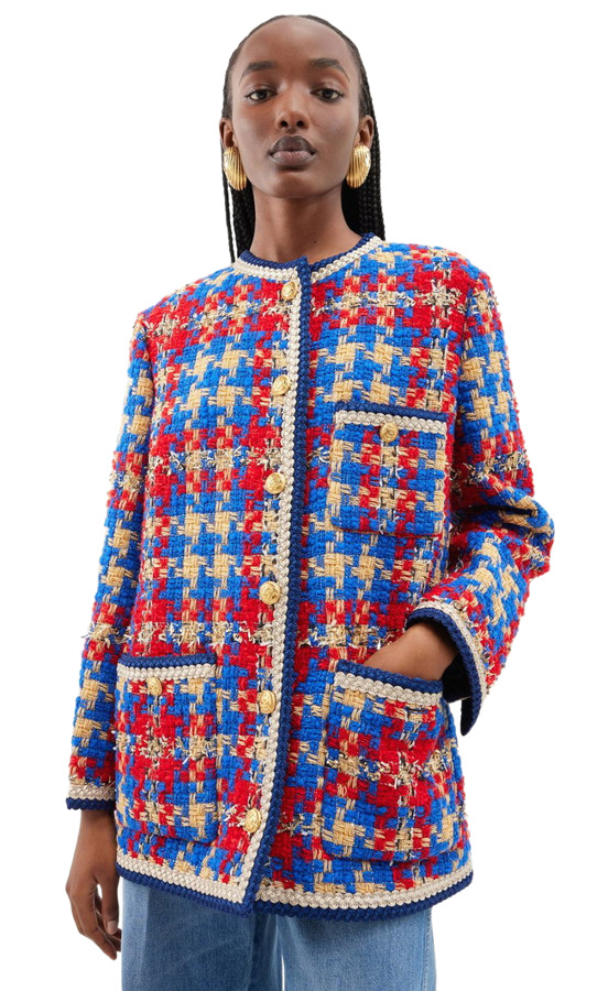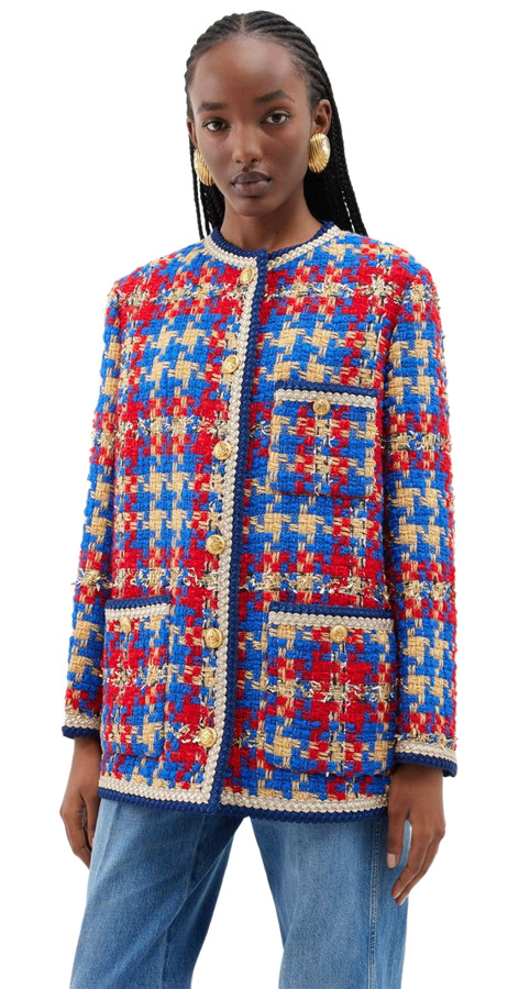 Make a statement with the Gucci Red and Blue Checked Tweed Jacket. Crafted from a bold blend of checked tweed, it features shimmering touches of lamé and Lurex, outlined with elegant braided edges. This luxurious jacket is a versatile addition to your wardrobe, offering a unique pop of color and texture for any occasion.