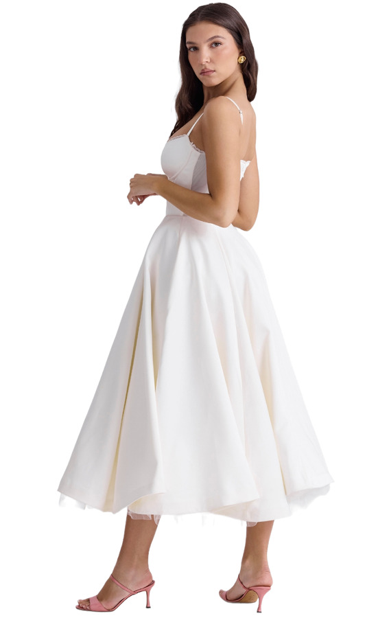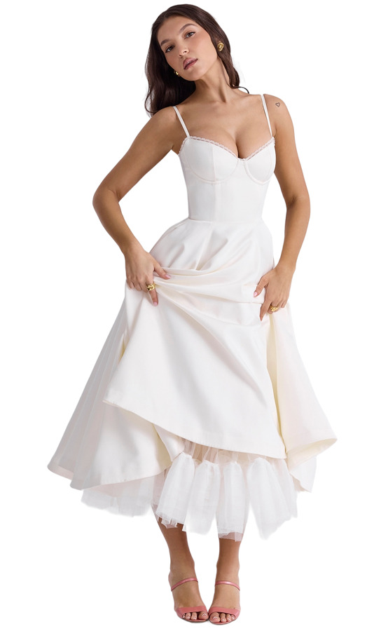 The 'Mademoiselle' dress from House of CB is crafted from luxurious duchess satin and fully lined for comfort. This exquisite garment features a hint of powermesh, a boned bodice to cinch the waist, and a pretty sweetheart neckline with underwired cups. Adjustable delicate straps ensure a perfect fit, while the floaty midi skirt is enhanced by a voluminous layer of soft tulle for a stunning silhouette. Note that the dress has little stretch.