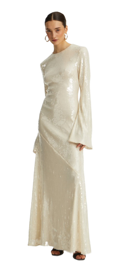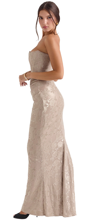 Meet ‘Persephone’, the sultry maxi dress that's a must-have for unforgettable evenings. With its daring peaked neckline and corseted bodice, this dress accentuates your figure while exuding confidence. The lush gold chiffon skirt drapes gracefully, creating a captivating silhouette that trails elegantly on the floor. Fully lined with sculpting power mesh, it offers a flawless fit that feels like invisible shapewear. Command attention with every step!