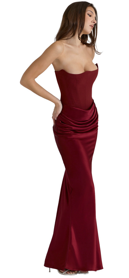 Designed for high-octane evenings, the Persephone Dress is crafted from stretch crepe and luxe silky satin. A strapless neckline and sculpting boned bodice define the waist, while a draped skirt falls to a dramatic puddle length. Finished with a concealed back zip and cup options for a flawless fit. Ideal for galas, black-tie events, weddings, proms, and glamorous nights out.