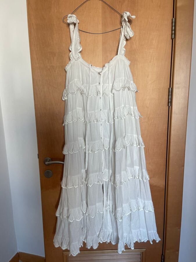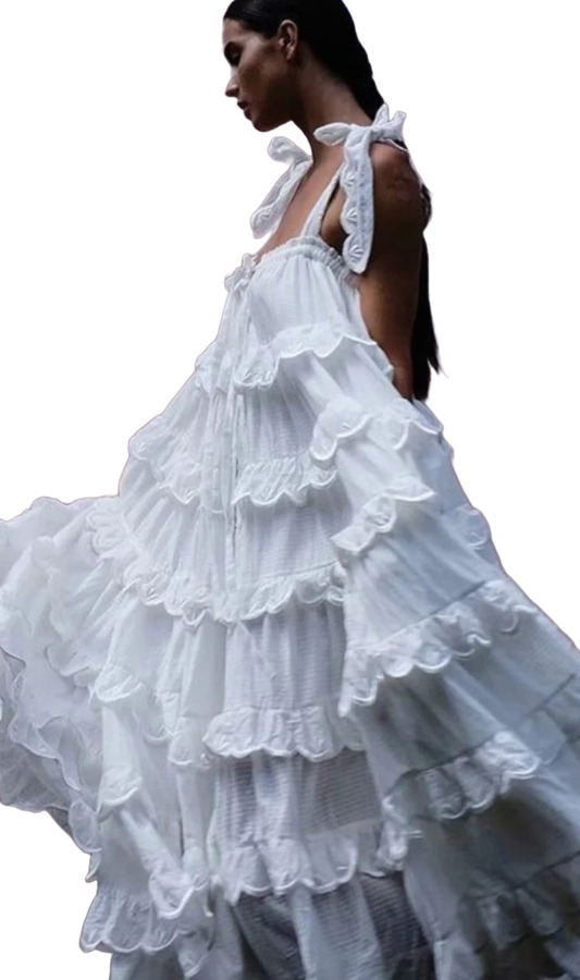 The Innika Choo Frill Dress is a stunning maxi that features cascading tiers with delicate scalloped embroidery. Oversized straps tied in playful bows add charm to its relaxed silhouette. Crafted from airy fabric, this dress offers effortless elegance, making it perfect for warm days and special occasions. Embrace your feminine side with this captivating piece!