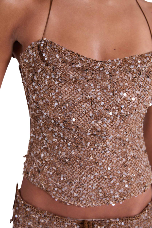 Shine bright in the Deva Sequin Knit Corset Top in Sand! This stunning piece features luxurious brown sequin mesh fabric with lace-up sides for a flattering fit. Crafted from non-stretch fabric and fully lined for comfort, it’s the perfect choice for glamorous evenings. Pair it with the matching trousers to create a show-stopping look that dazzles!