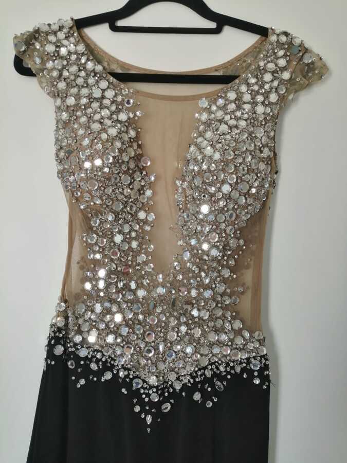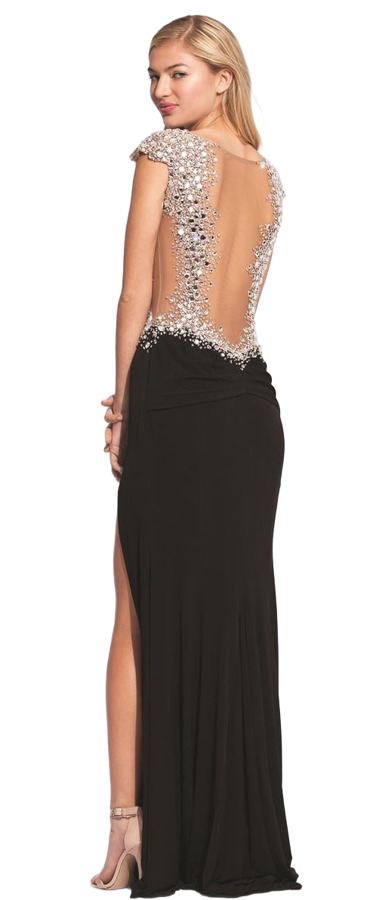 This floor-length jersey dress by Jovani features sheer panels along the bodice, beautifully adorned with embellishments. A sexy slit adds drama and allure, making it a standout choice for any formal occasion. The elegant design ensures a flattering silhouette, perfect for making a memorable entrance at events.