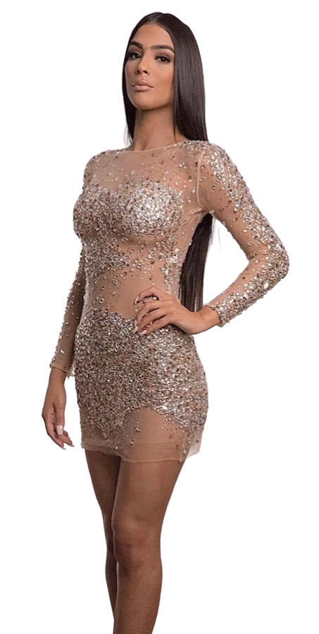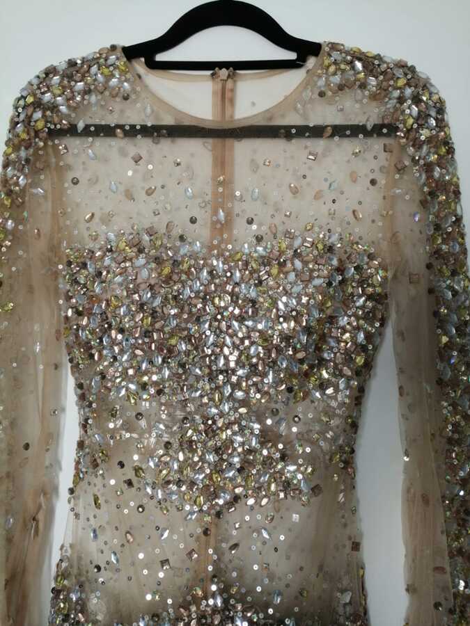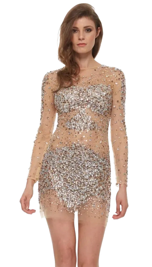 This gorgeous Jovani Dress features a stunning nude tulle design with a crystal-embellished overlay. Adorned with mocha and nude crystals, this gown offers a glamorous touch. It includes concealed bra cups for support and a back zip for a secure fit, making it perfect for elegant events and special occasions.