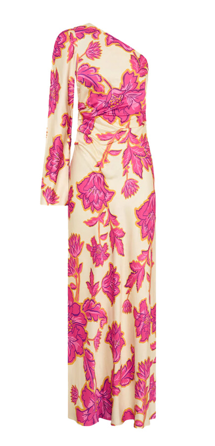 The Rhia One Sleeve Maxi Dress is a beautiful piece adorned with hand-painted vibrant pink florals outlined in tangerine against a soft cream base. This dress features a bias cut that enhances its flow and drape, along with an asymmetrical neckline and a subtle flared hem. Perfect for making a statement at any occasion, the Rhia dress combines artistic design with effortless elegance!