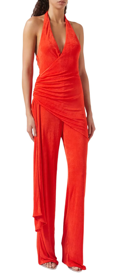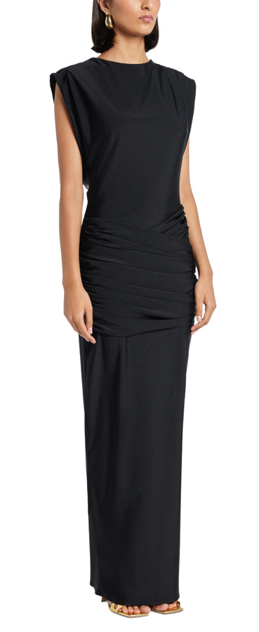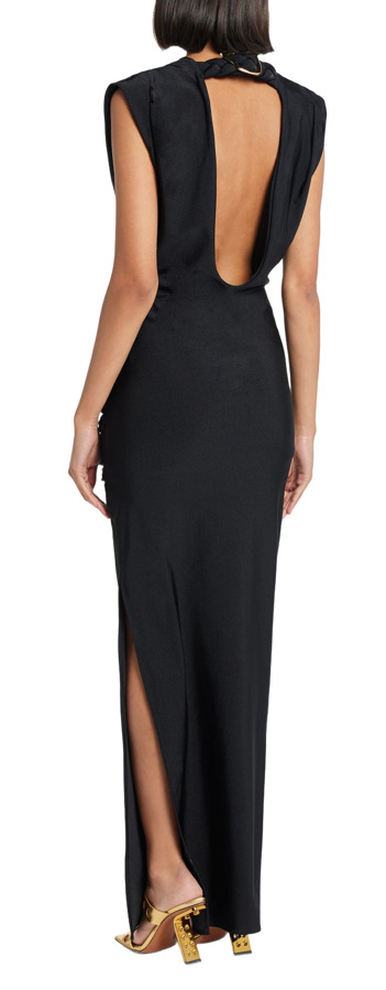 This black long dress features structured shoulders and a side drape that defines the waist. The back showcases a unique hardware detail and a braided accent at the neck, adding a chic touch. With a clean, sophisticated silhouette, this dress is perfect for elevating your look on any special occasion. Effortlessly stylish and timeless!