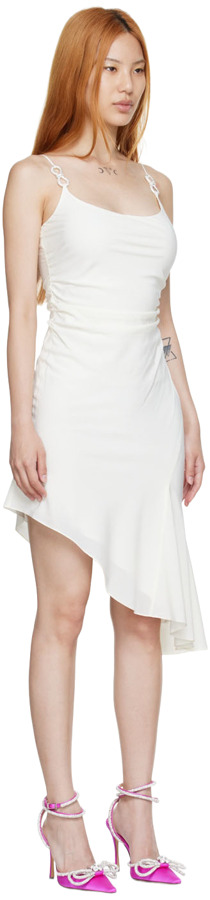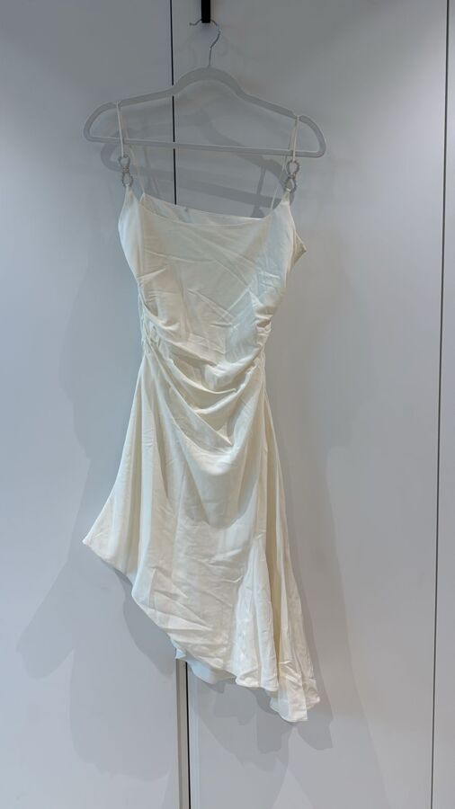 This stretch silk chiffon dress is effortlessly elegant, featuring all-over ruching for a flattering look. The scoop neck is complemented by crystal-cut bow accents on the fixed shoulder straps. With a concealed side-seam zip closure and an asymmetric hem, this dress combines sophistication with style. Fully lined in satin, it ensures comfort and a smooth silhouette. Perfect for any special occasion!