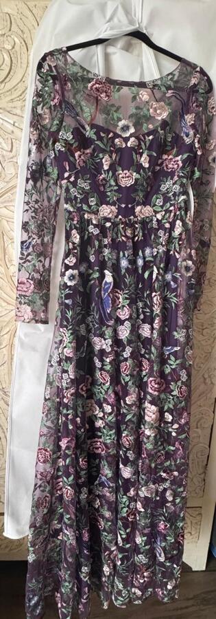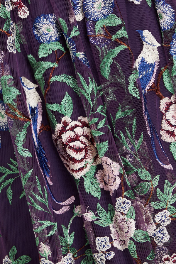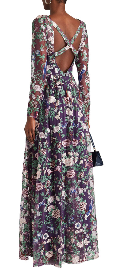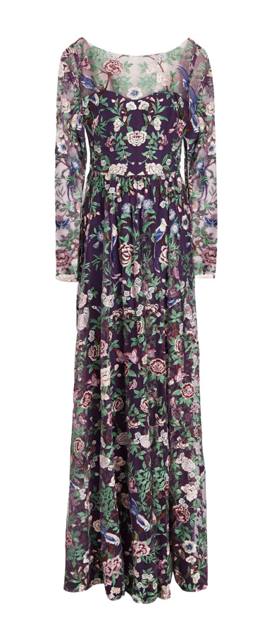 Turn heads at your next garden party or summer wedding in this stunning floral-print gown by Marchesa Notte! Crafted from beautifully embroidered tulle, it features a whimsical cutout design that's both romantic and edgy. With a concealed hook and zip fastening at the back and a fully lined, mid-weight fabric, you'll dance the night away in effortless style!