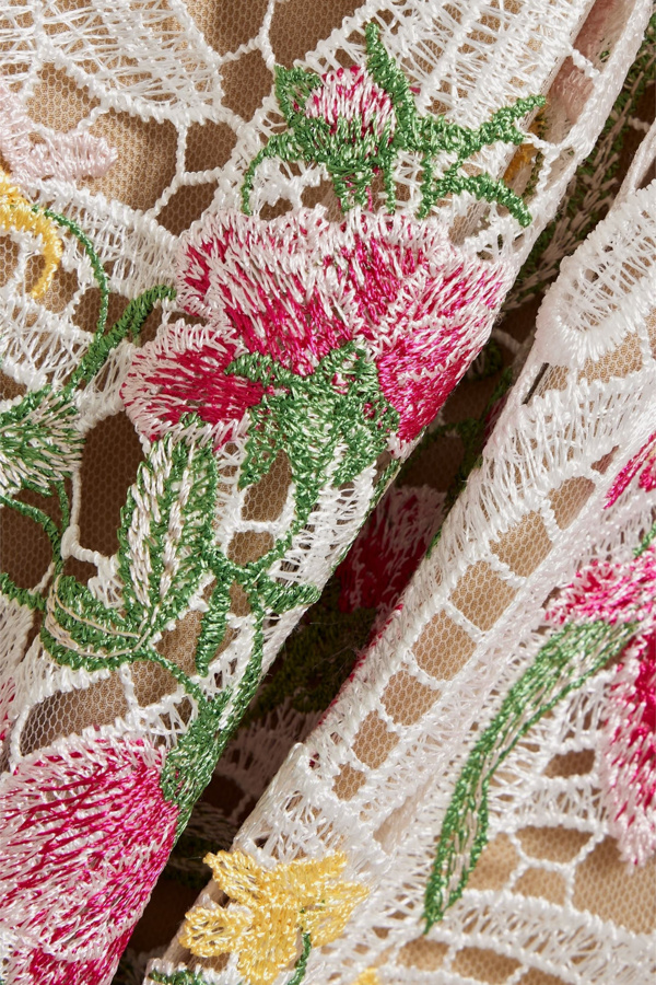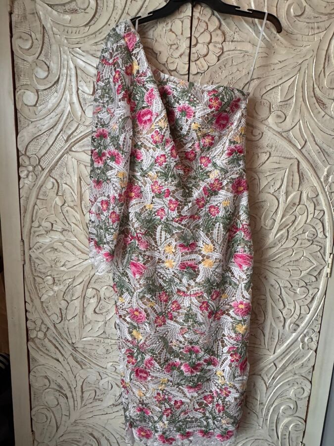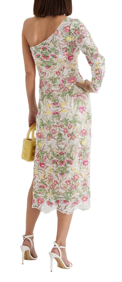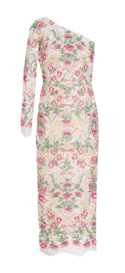 Marchesa Notte’s midi dress is a stunning choice for elegant daytime receptions. Crafted from white macramé lace and adorned with delicate pink and yellow embroidered florals, it exudes feminine charm. The modern one-shoulder silhouette, complemented by a side split, ensures both style and ease of movement. This dress beautifully balances classic elegance with contemporary flair.