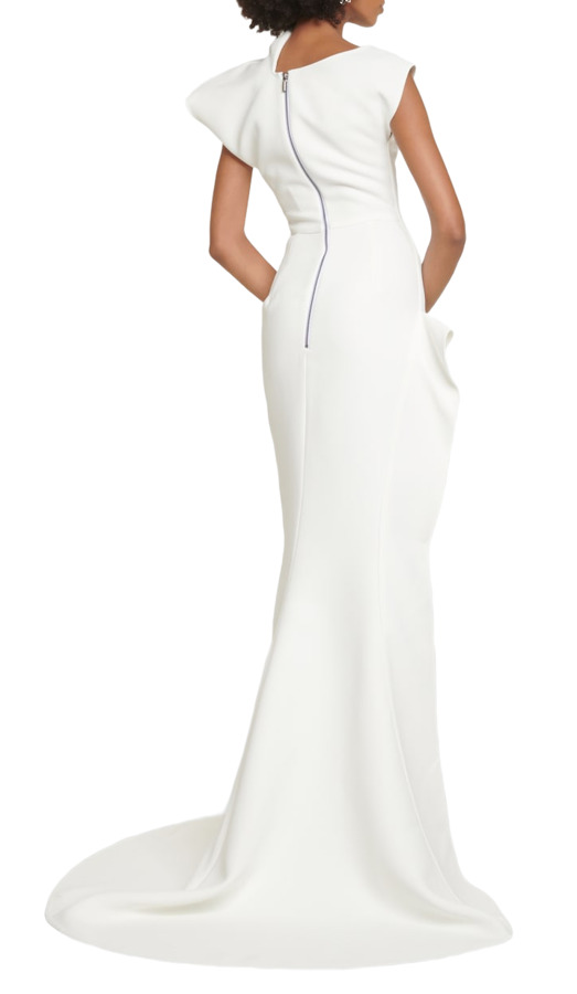 The Victoire gown by Maticevski embodies fierce elegance with its sculptural asymmetric form. Crafted from 100% polyester, this stunning white gown features capped sleeves and an irregular neckline that exudes sophistication. The design is accentuated by a daring ruffled thigh-high side slit, making it a bold choice for those who want to make a lasting statement at any event!