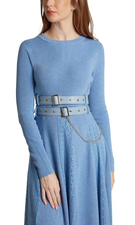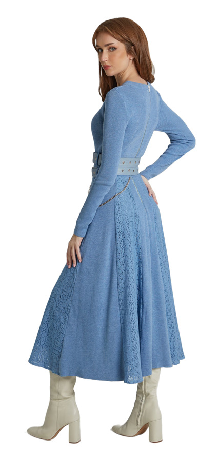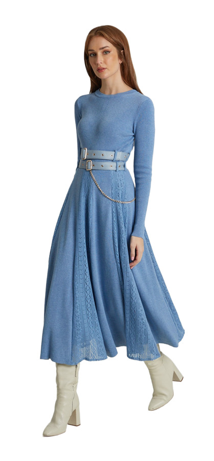 Discover timeless elegance with the Myron Dress by Mayka. This midi-length design showcases intricate lace and knit panels, enhanced by a stylish double eyelet belt featuring a chic chain. Made from soft knit and lace, this dress offers comfort and sophistication, perfect for any occasion!