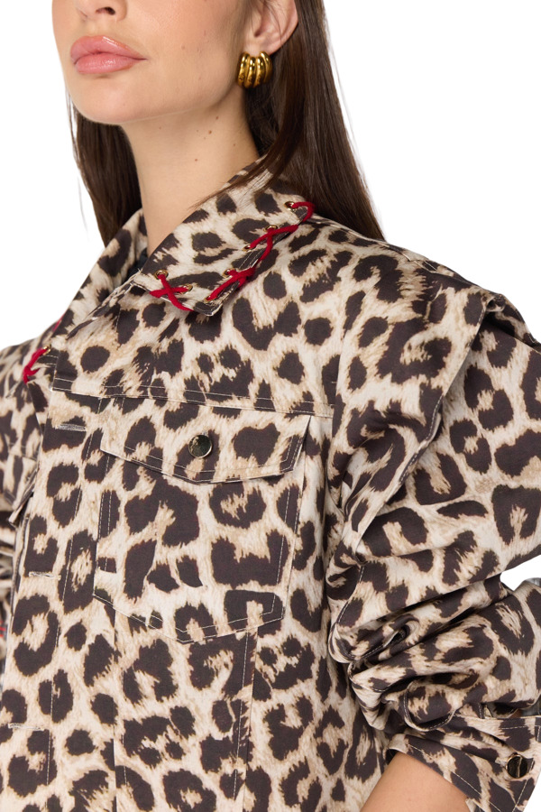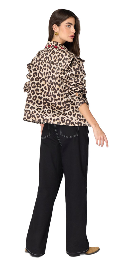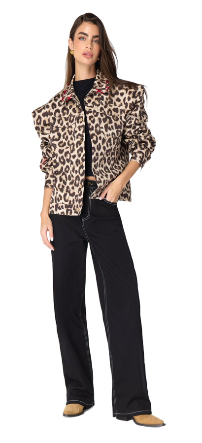 Make a bold statement with the Patay Jacket by Mayka. This striking leopard print jacket features sophisticated shoulder pads and unique rope details on the collar. Crafted from luxurious jacquard fabric, it combines elegance and flair, making it the perfect statement piece for any outfit!