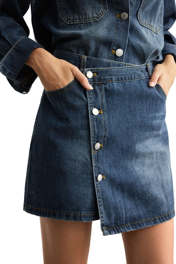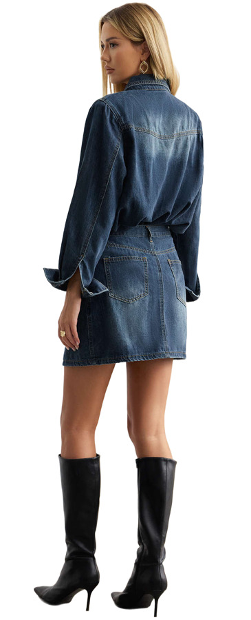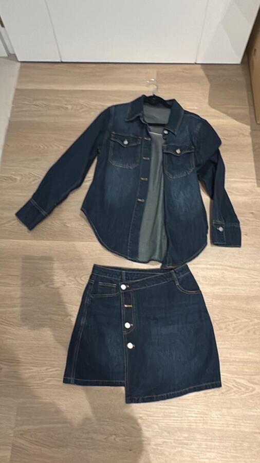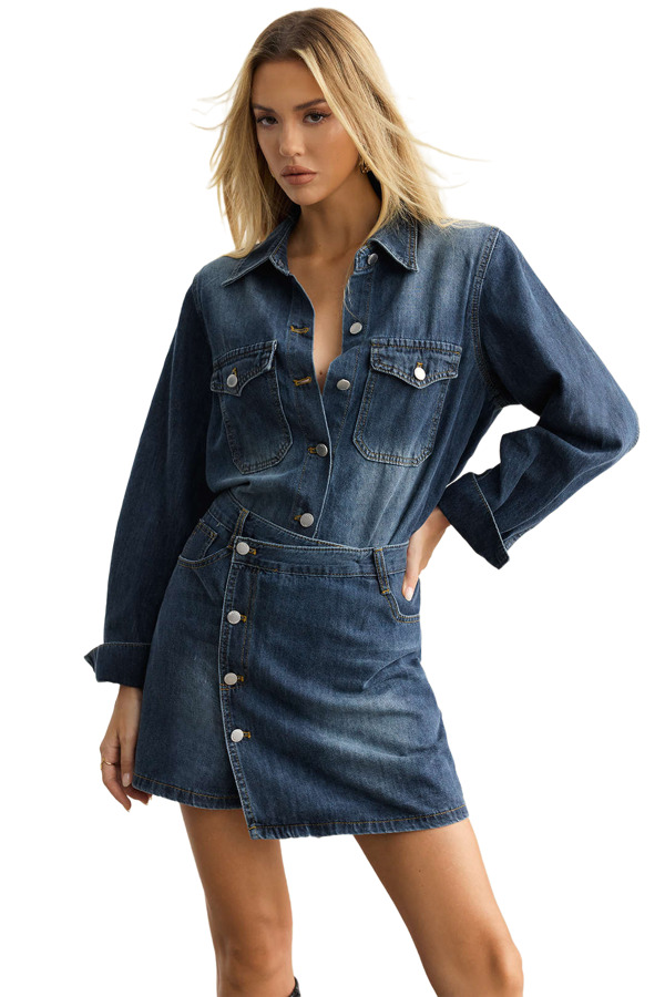 Upgrade your casual style with this fashionable set that includes a long-sleeve button-up top made from denim and a matching high-waisted mini skirt. The top features a timeless design with functional pockets and a comfortable fit, while the skirt showcases a stylish wrap detail, creating a flattering silhouette. Perfect for casual events or a chic night out!