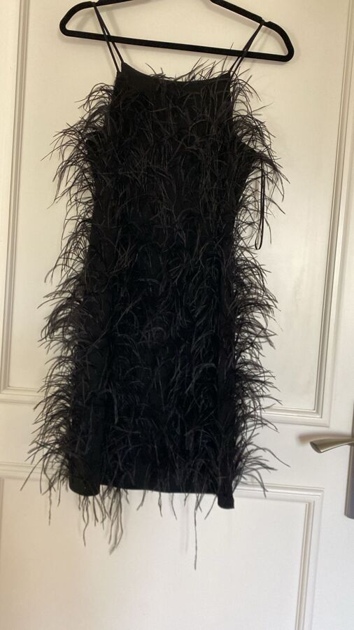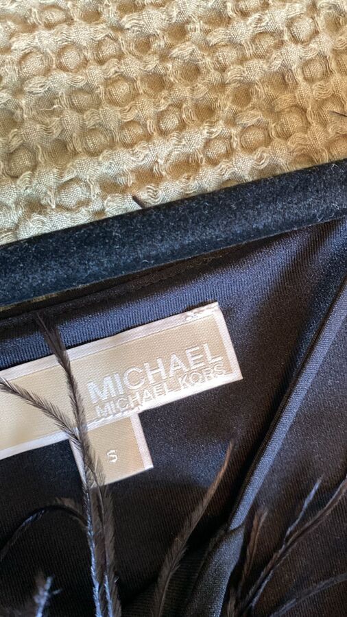 Exuding bold, statement-making style, this mini dress from MICHAEL MICHAEL KORS is adorned with a captivating black ostrich feather embellishment. Crafted with a stretch-enhanced fabric, the design features delicate spaghetti straps and a short, leg-baring silhouette. The feather detailing adds a touch of alluring, tactile texture, elevating this striking party-ready piece.