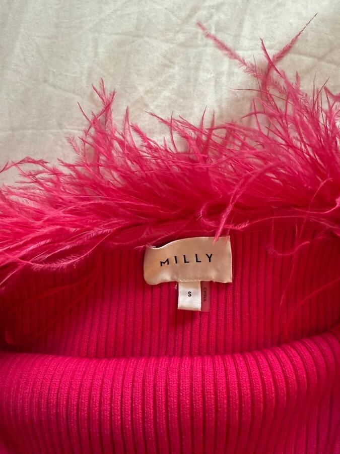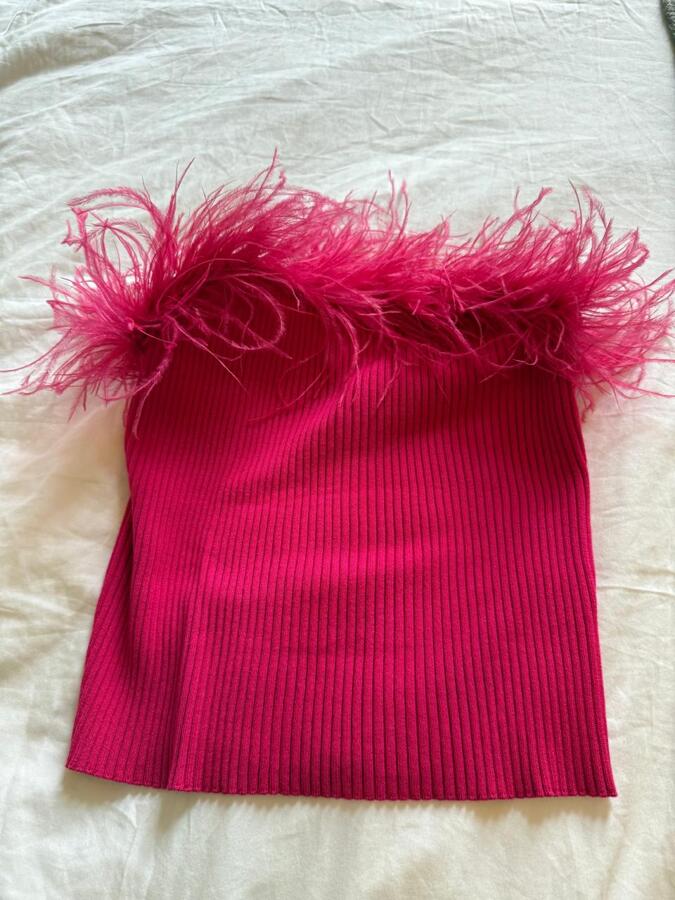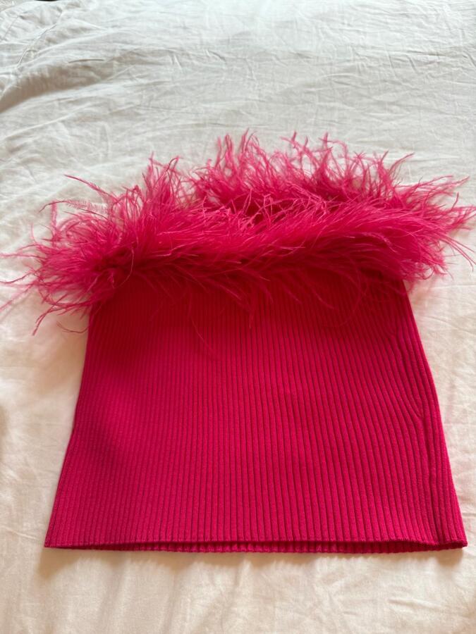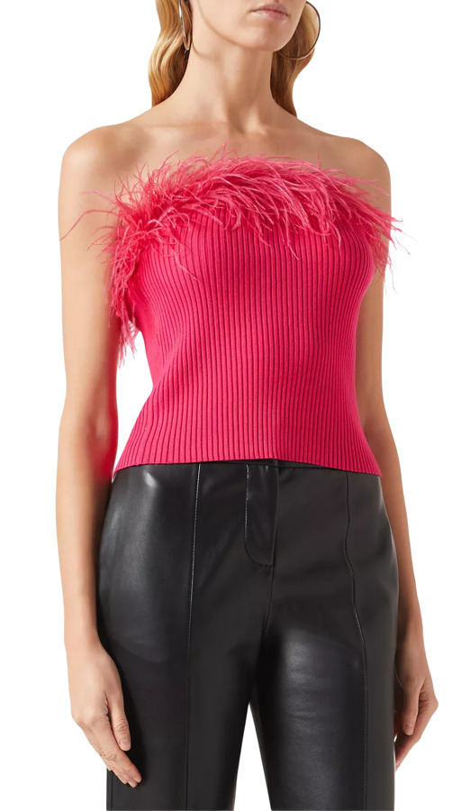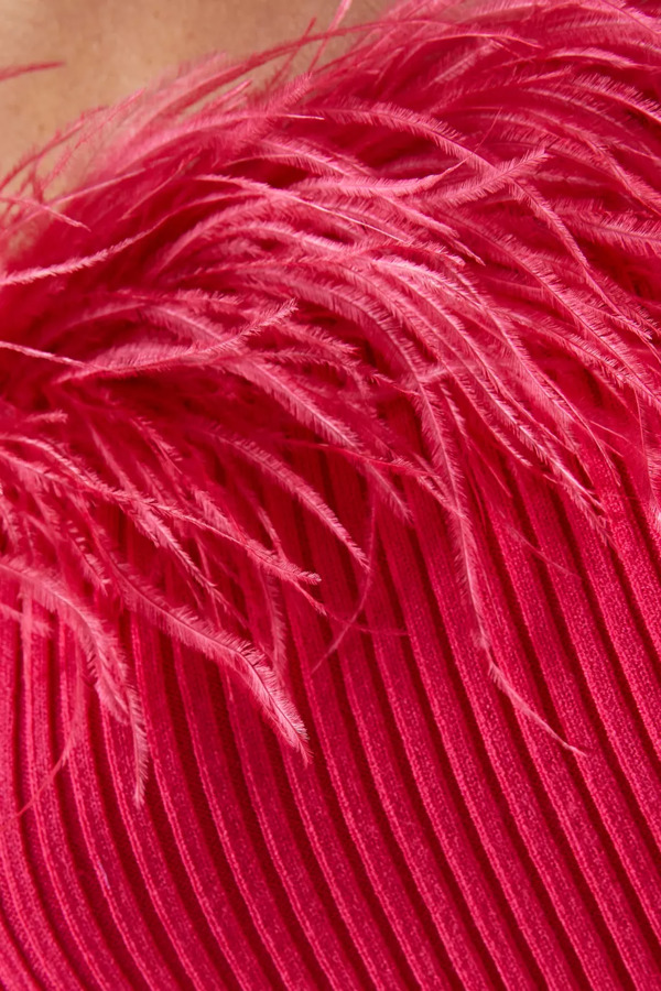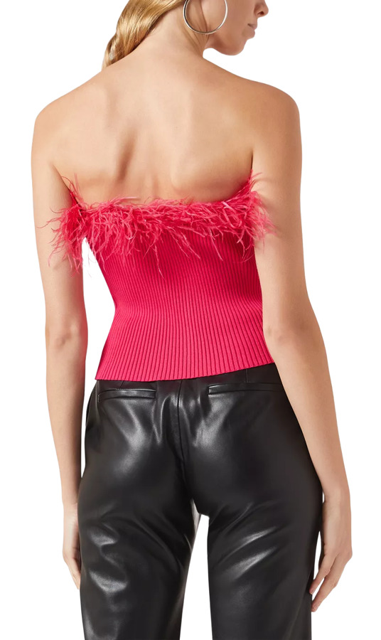 Unleash vibrant glamour with the Milly Feather Trim Top from the new collection. This stunning piece features a slim-fitting silhouette crafted from soft knitted fabric, while a fluttery feather trim at the strapless neckline adds a delightful feminine flair. Elevate your style and turn heads at any occasion with this eye-catching top!