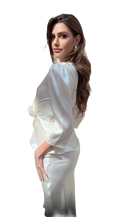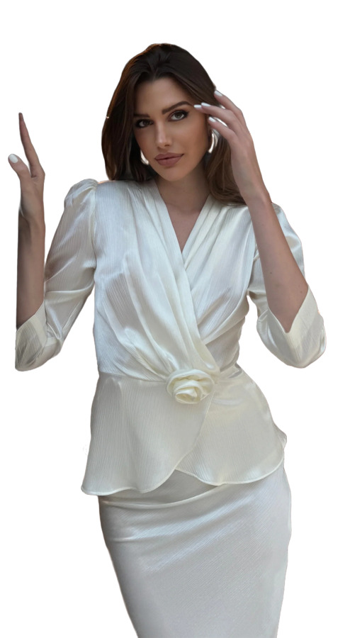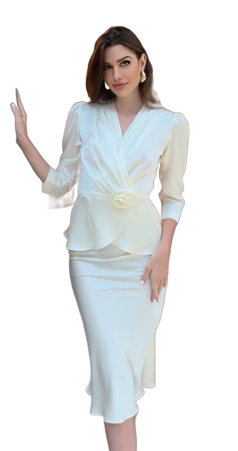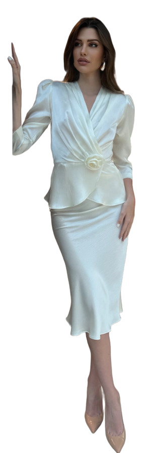 The Miron Atelier ensemble features a graceful ivory wrap blouse with puffed sleeves, elegantly cinched at the waist with a delicate floral detail. Paired with a sleek, form-fitting midi skirt that subtly flares at the hem, this refined set exudes sophistication and femininity, perfect for any upscale occasion.