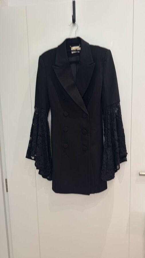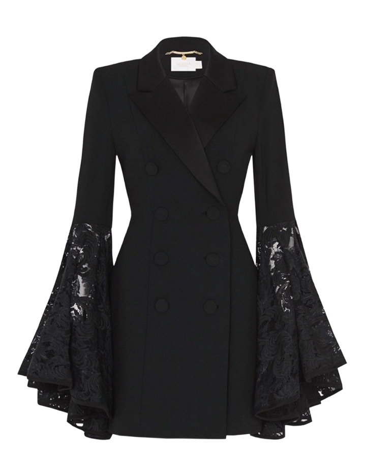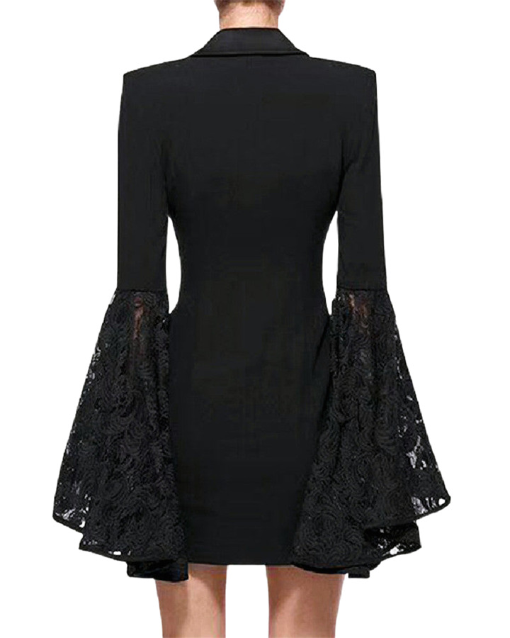 Step into elegance with this stunning black mini dress featuring chic double-breasted styling. The sophisticated blazer silhouette is beautifully complemented by dramatic lace bell sleeves, adding a touch of romance to a modern classic. Perfect for cocktail parties or upscale events, this dress effortlessly combines fierce style with feminine flair.