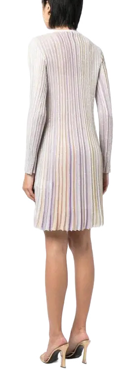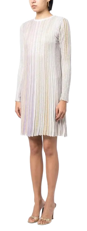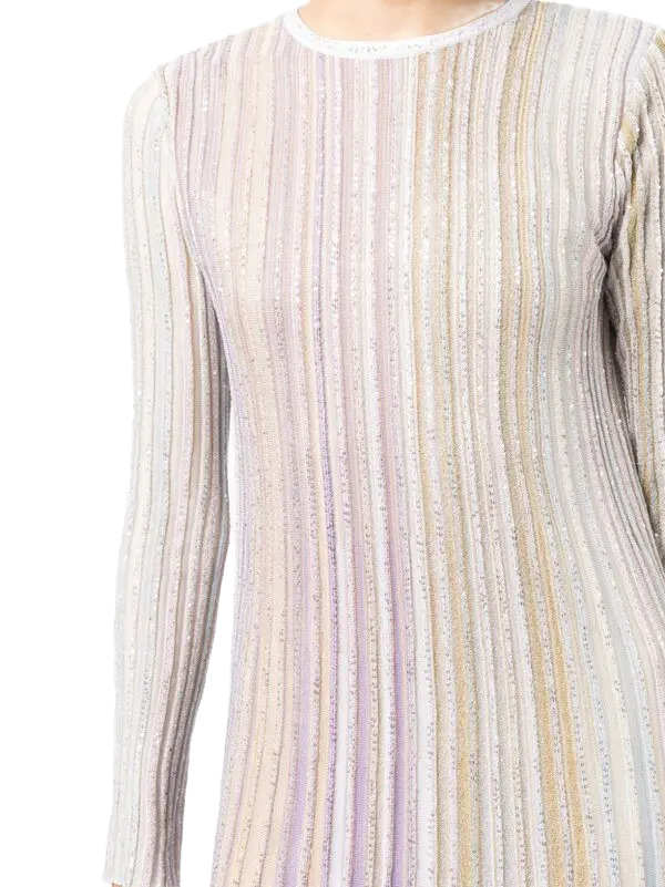 This Missoni fine-knit mini dress combines stylish striped intarsia with a metallic weave and sequin embellishments for a glamorous touch. Featuring a round neck and ribbed details, it includes a comfortable slip lining and offers a relaxed fit. Perfect for making a statement, this dress effortlessly blends chic elegance with playful sophistication!