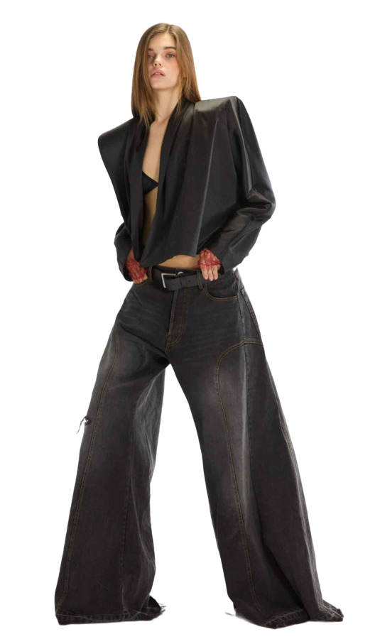These low-waisted wide-leg denim pants feature a stylish curved side seam and a raw edge for a modern touch. For a mid-waist fit, it's advisable to size down one size. Perfect for a trendy, relaxed look, they offer both comfort and versatility in styling. Ideal for casual outings or dressing up with the right accessories.