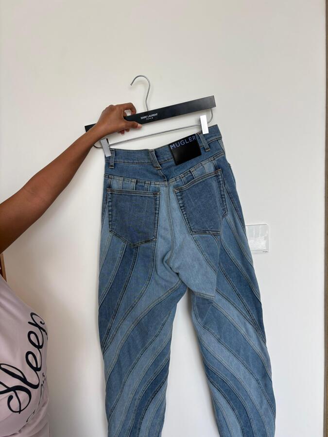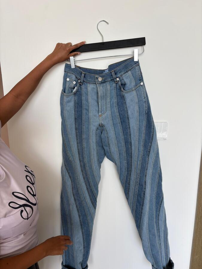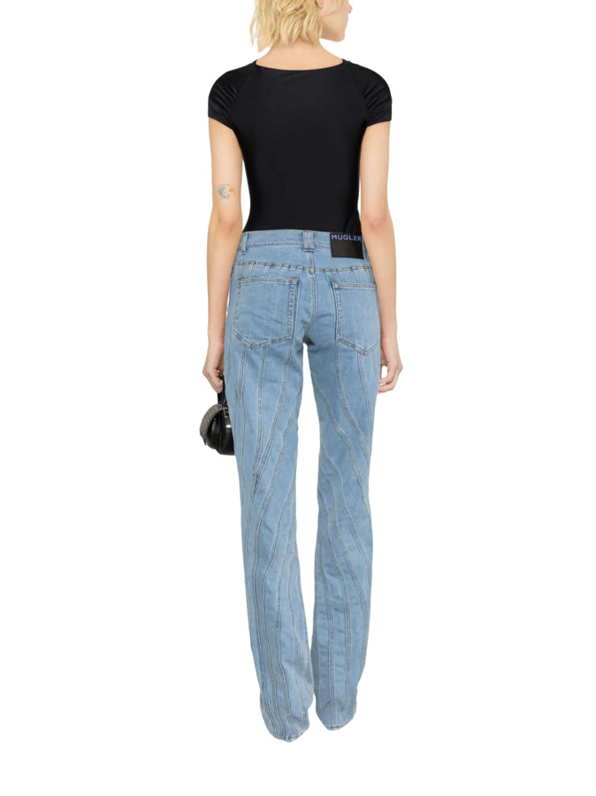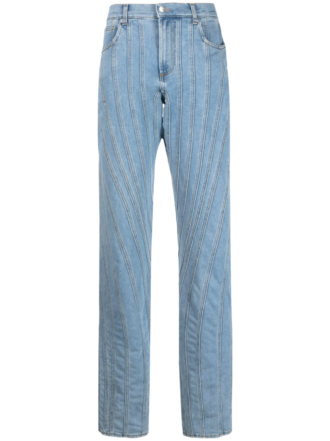 These straight-leg jeans are crafted from blue denim and enhanced with the brand’s signature spiral seams that subtly highlight the body's natural contours.