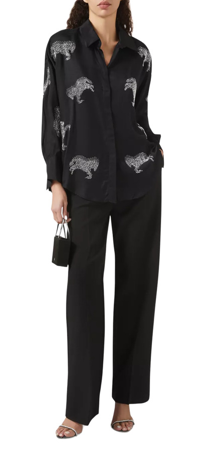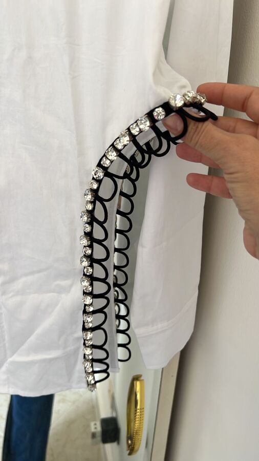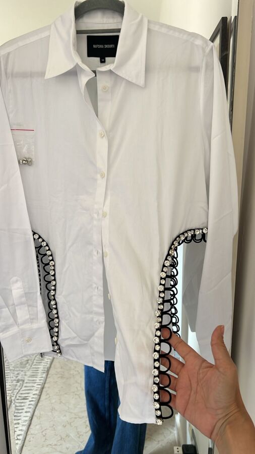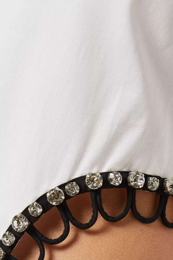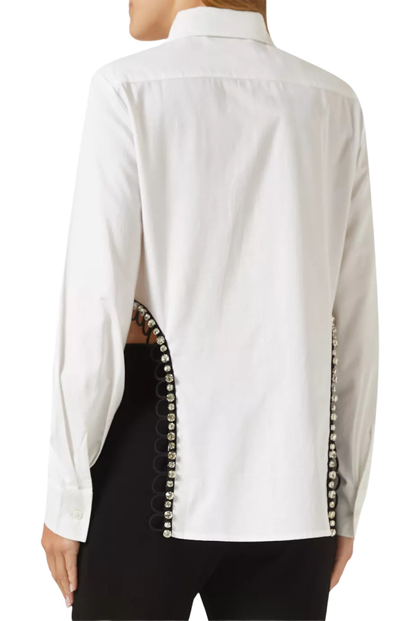 Signature and statement-making, this Nafsika Skourti cotton shirt redefines classic tailoring. Crisp and structured, it’s elevated with the brand’s iconic motif, daring side cut-outs, and a crystal-studded scalloped hem that steals the spotlight. What starts as a timeless button-up quickly transforms into an evening-ready piece with decadent, fashion-forward edge.