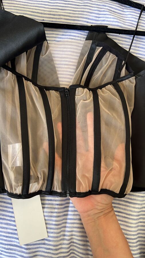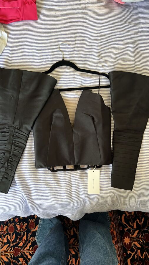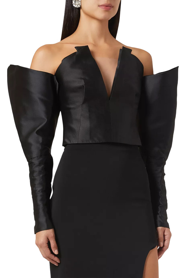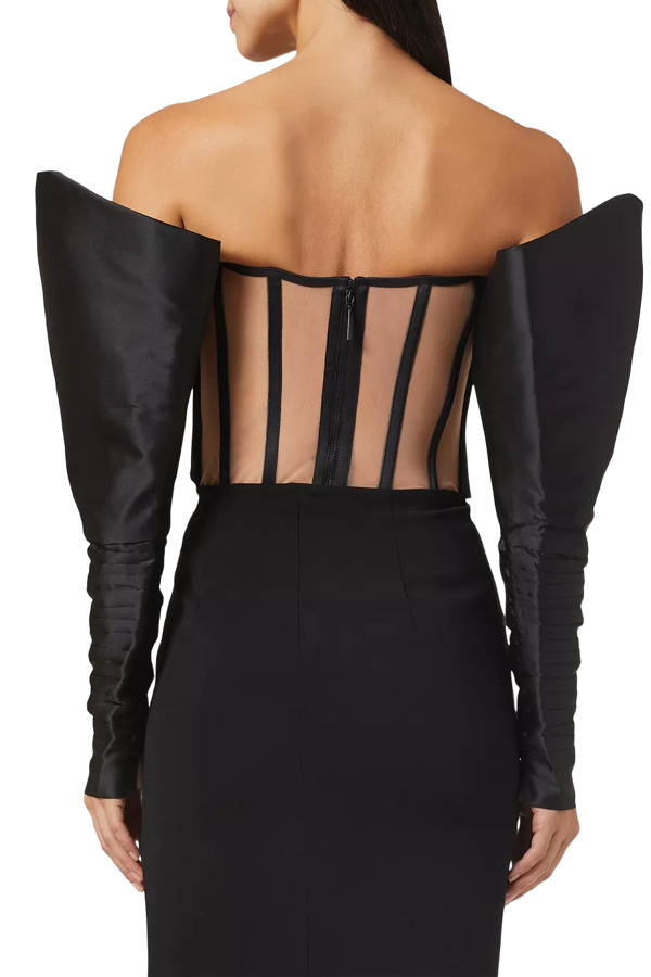Turn up the drama with the Hollywood top from Nafsika Skourti’s latest collection. Sculpted in lustrous satin, it features corset-style boning, a sultry plunge neckline, and a sheer tulle back panel. Finished with the label’s signature statement sleeves, it’s made for high-octane nights and unforgettable entrances.