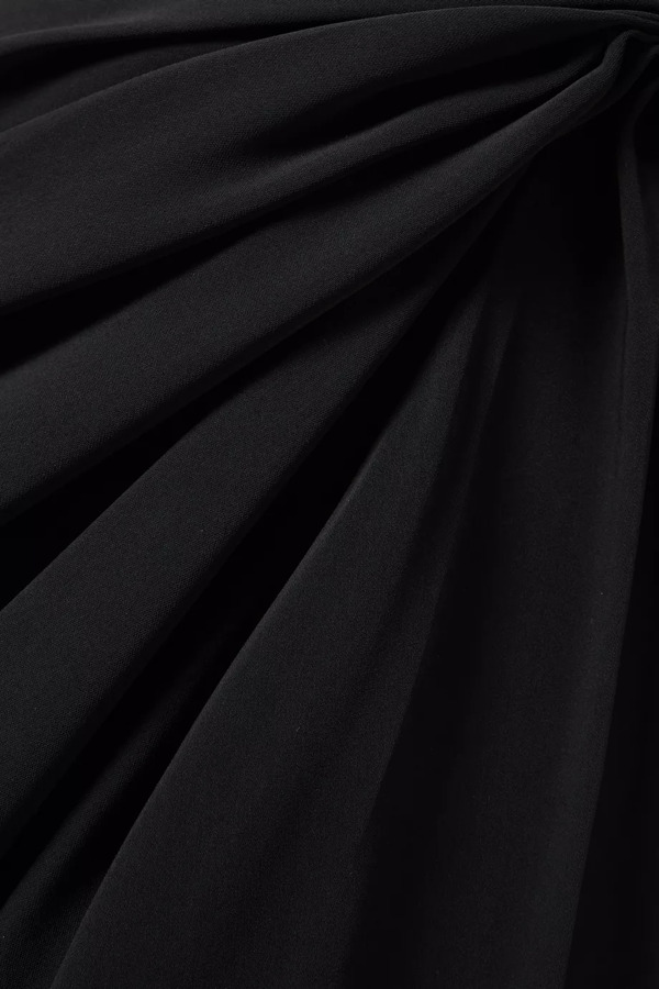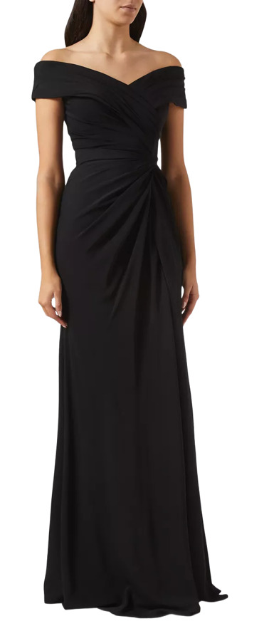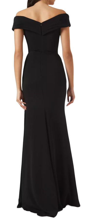 Experience the artistry of NASS in this impeccably detailed black gown. Cut from lightweight fabric that drapes flawlessly, it features a flattering V-neckline, cap sleeves, a side-twist gather, and a sleek side slit for effortless elegance. Finished with a floor-sweeping hem and perfect-fit alterations, it’s made to stun in person—and in every photograph.