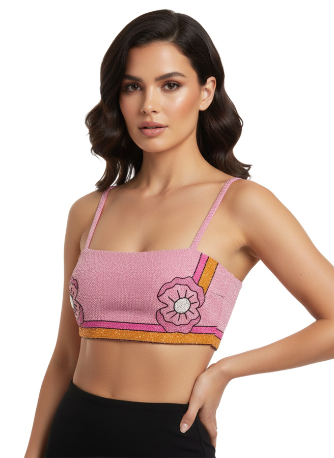 Revamp your summer collection with the Oceanus crop top, a lively piece embellished with an array of colorful floral beads. With adjustable straps and a flattering fit, it’s ideal for beach trips or summer gatherings. The striking design features playful pink and orange patterns, ensuring you make a memorable impression. Team it with the matching skirt!